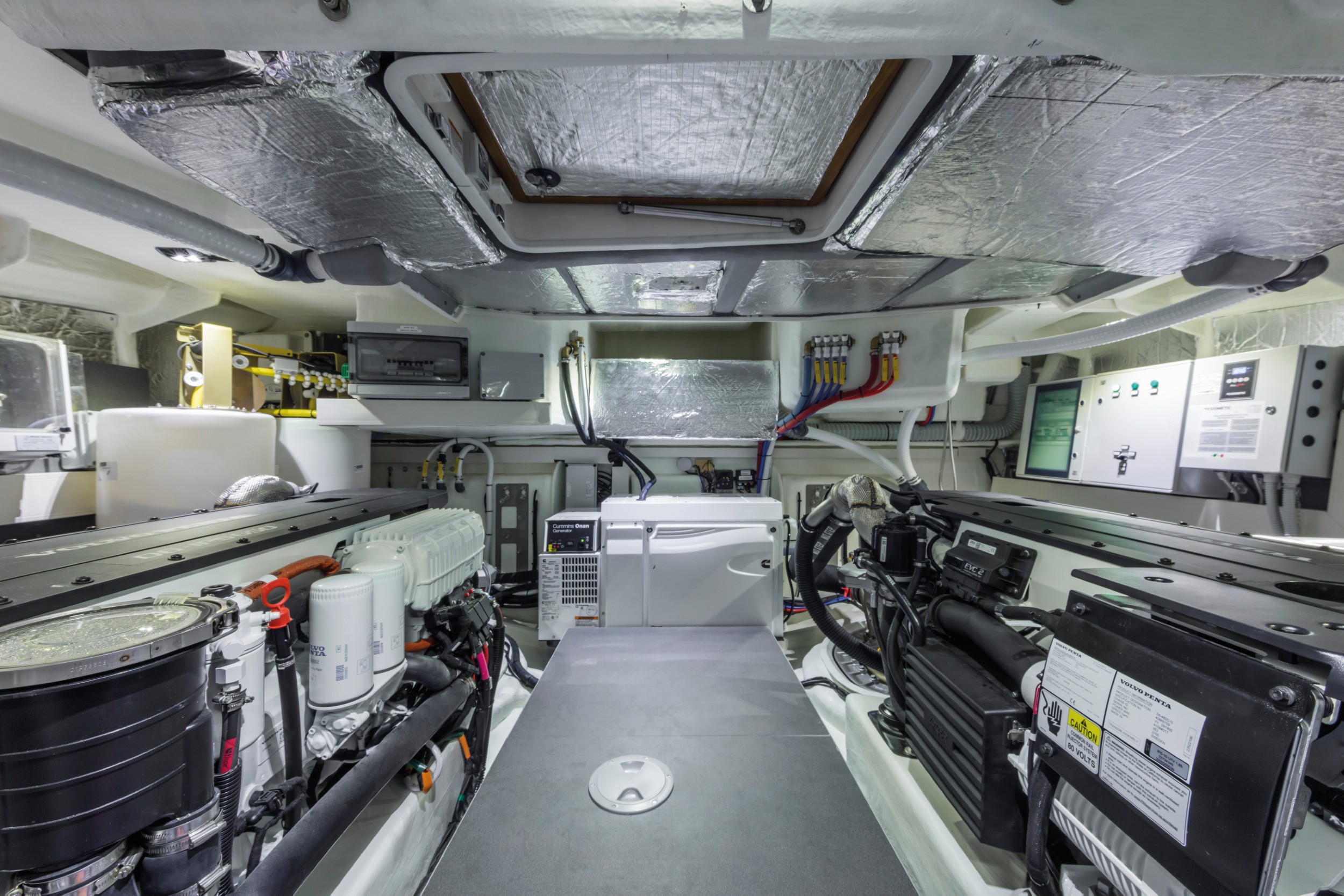 The master cabin is at the bow, raised from the floating level without steps, and with a spacious closet. A vanity desk and an en-suite head with a porthole in the shower are also present.