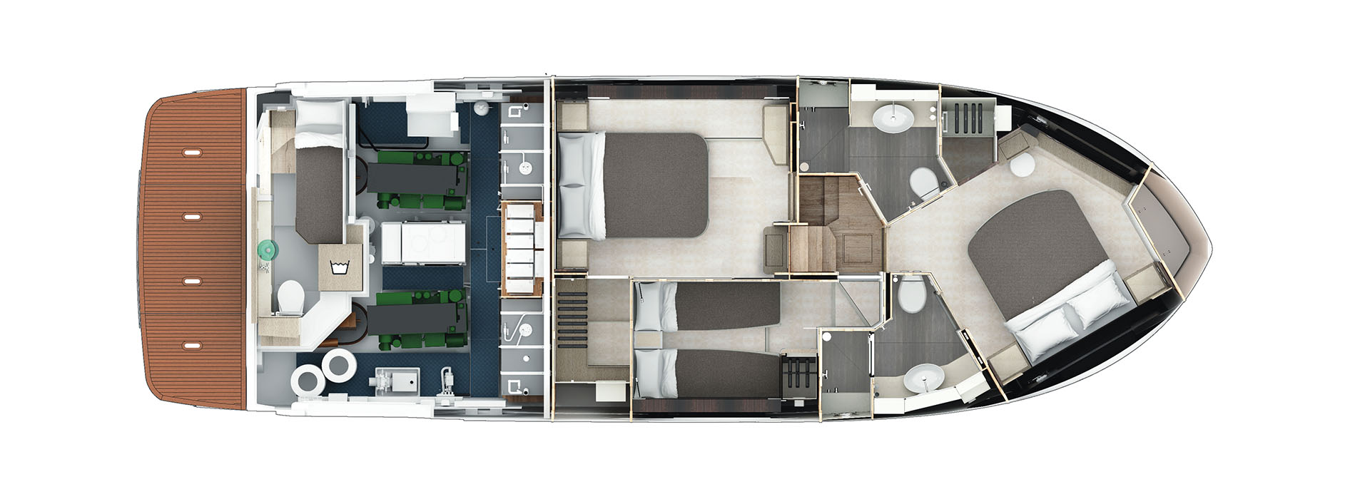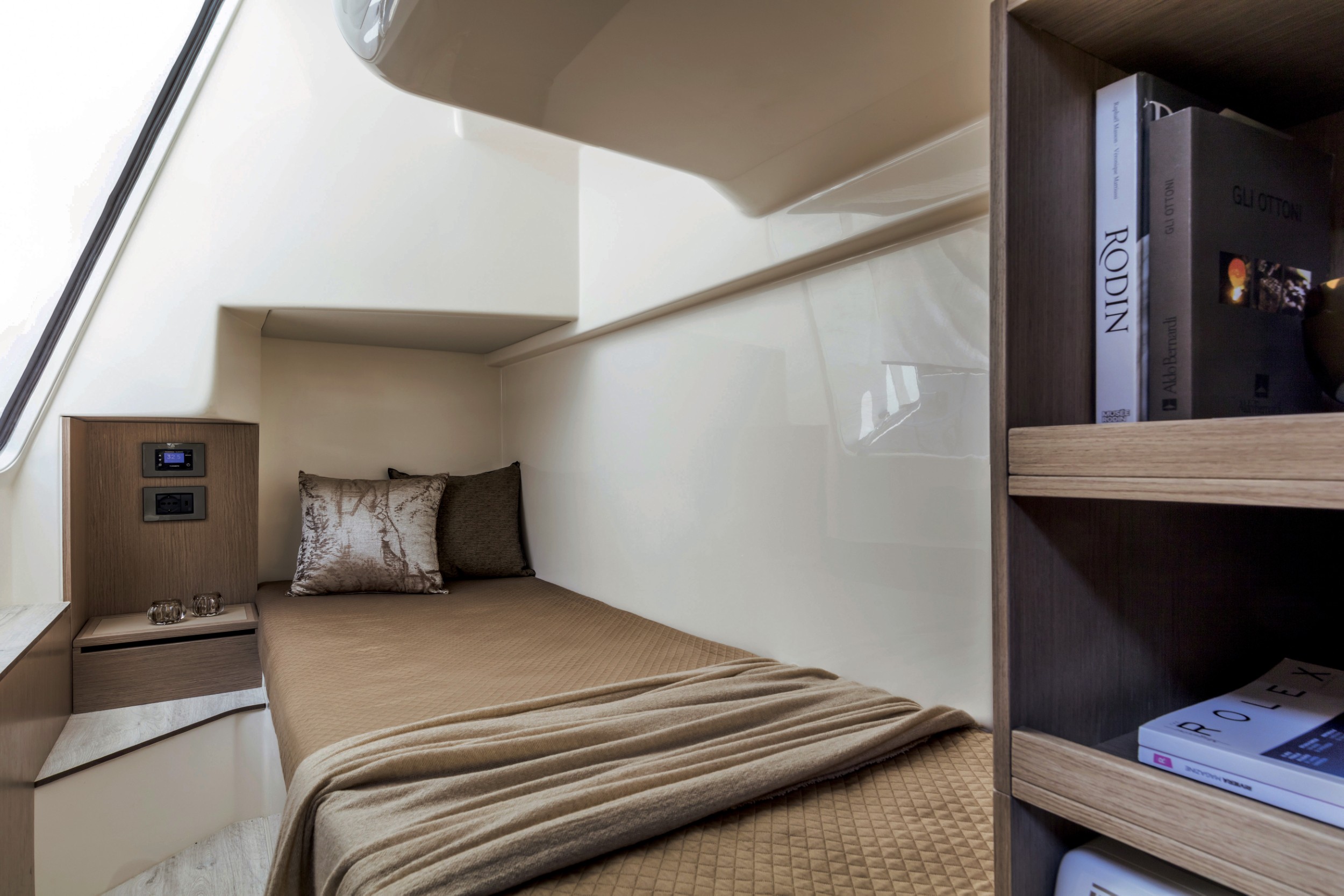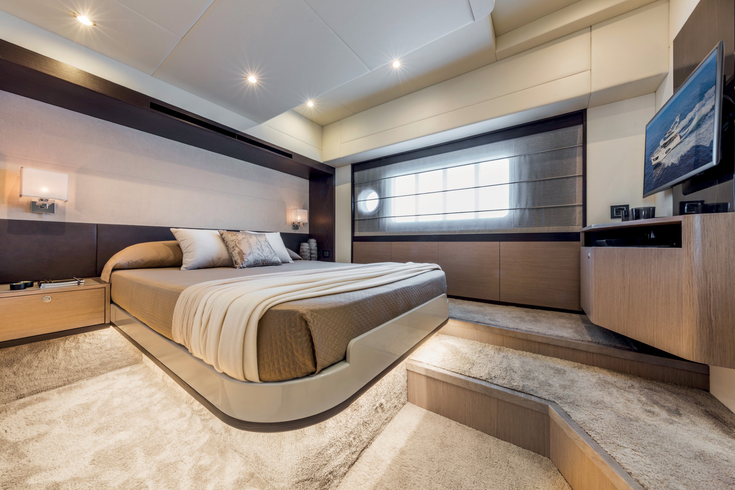 The Navetta 48 features a uniquely raised forward master suite that maximizes headroom, floor space, and comfort in a sub-50-foot yacht. This innovative layout creates a more open, residential feel with generous storage, large windows, and a bright, airy atmosphere rarely found in this class.