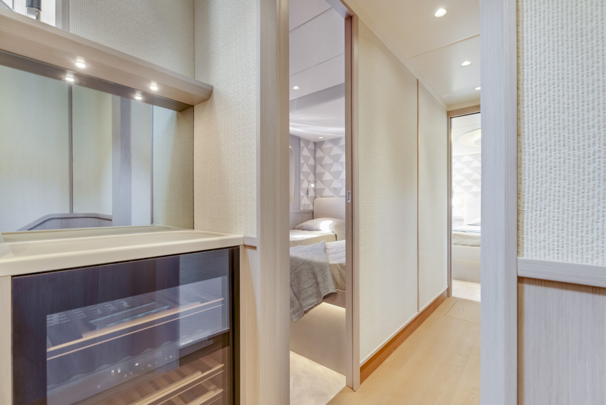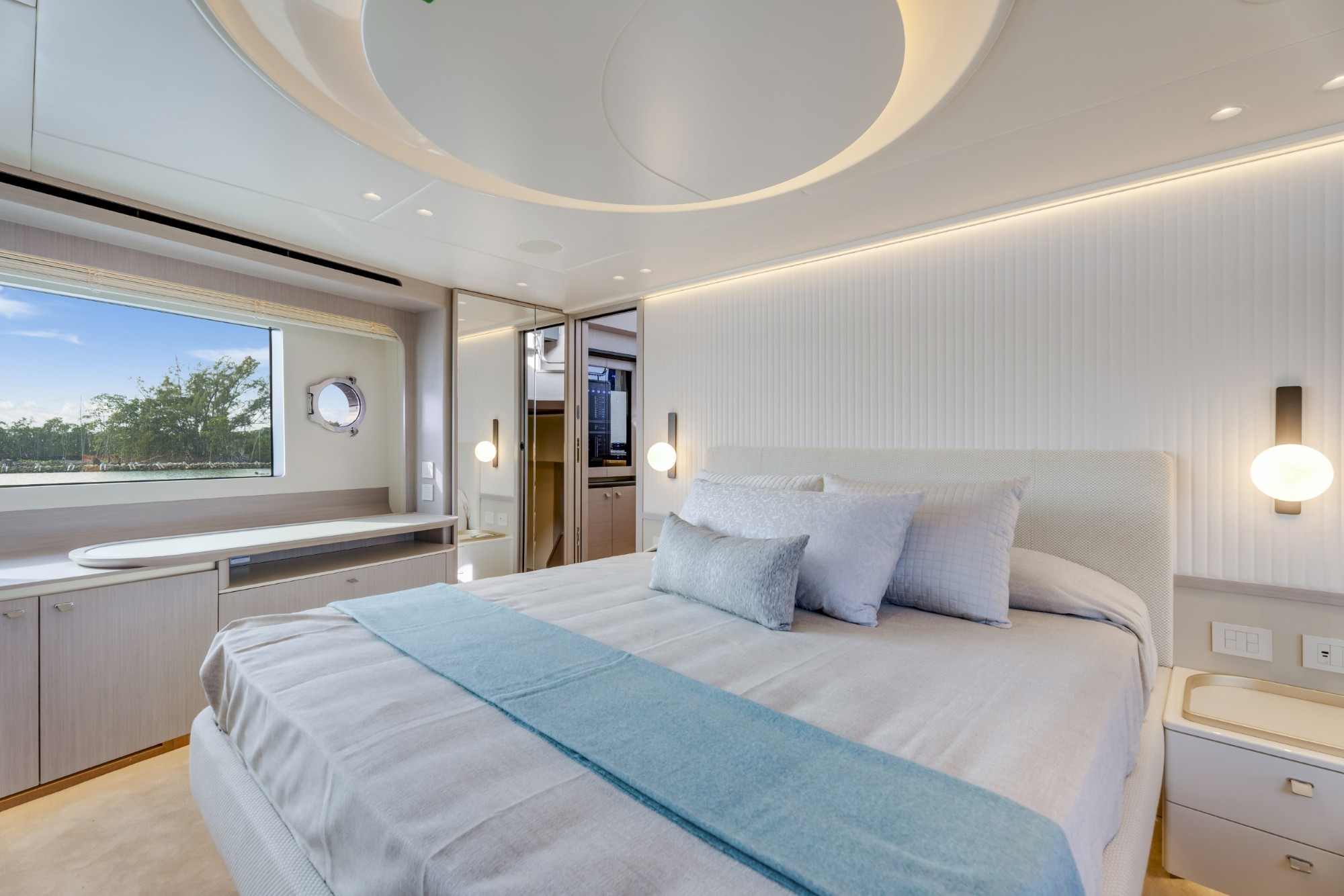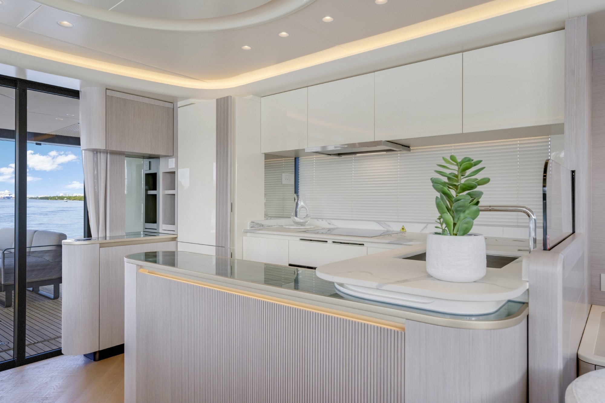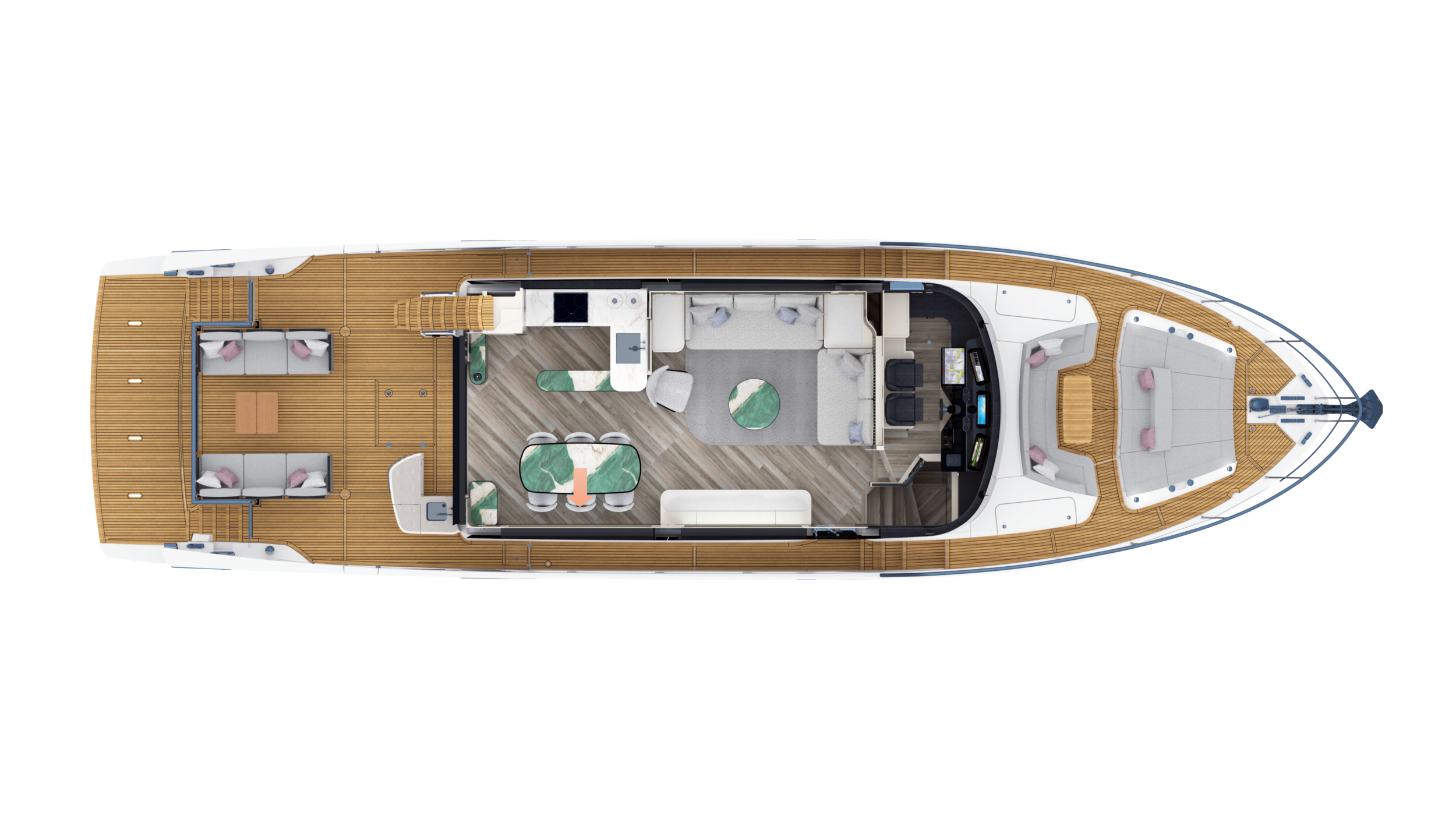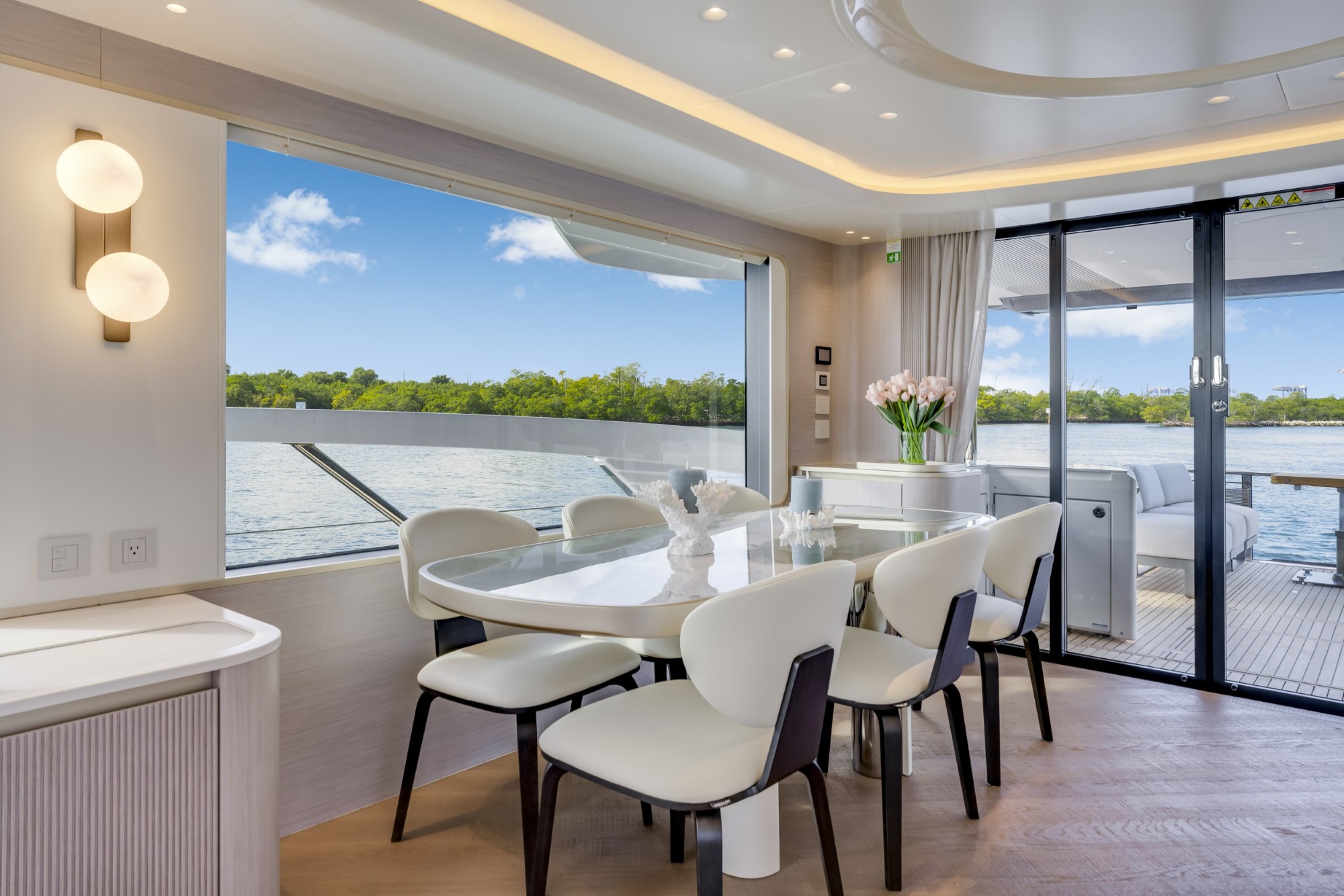 The Navetta 70 is built around expansive glazing and glass railings that create uninterrupted views from nearly every space onboard. This design floods the interior with natural light and enhances the feeling of openness, making the yacht feel significantly larger than its 70-foot length.