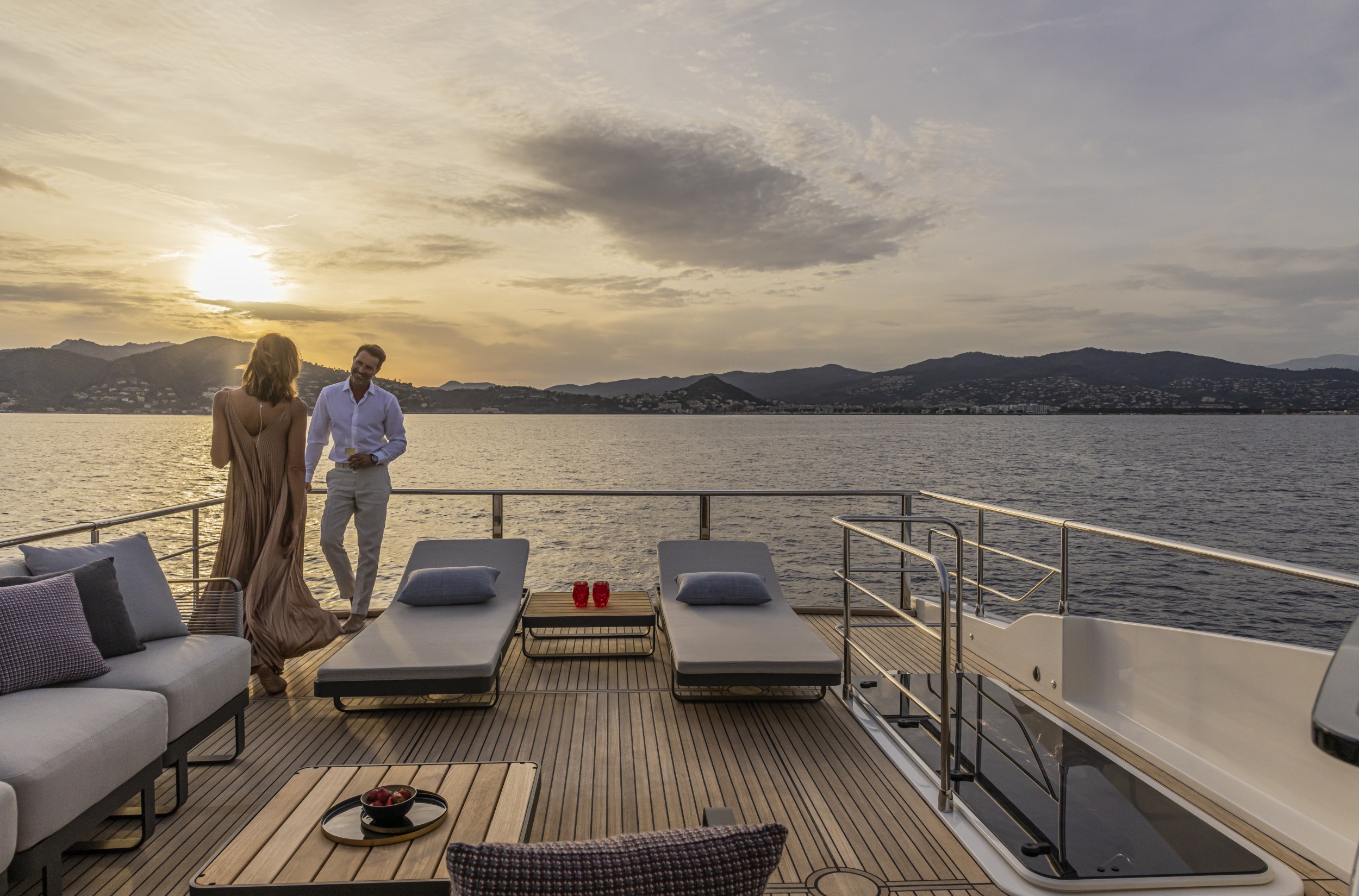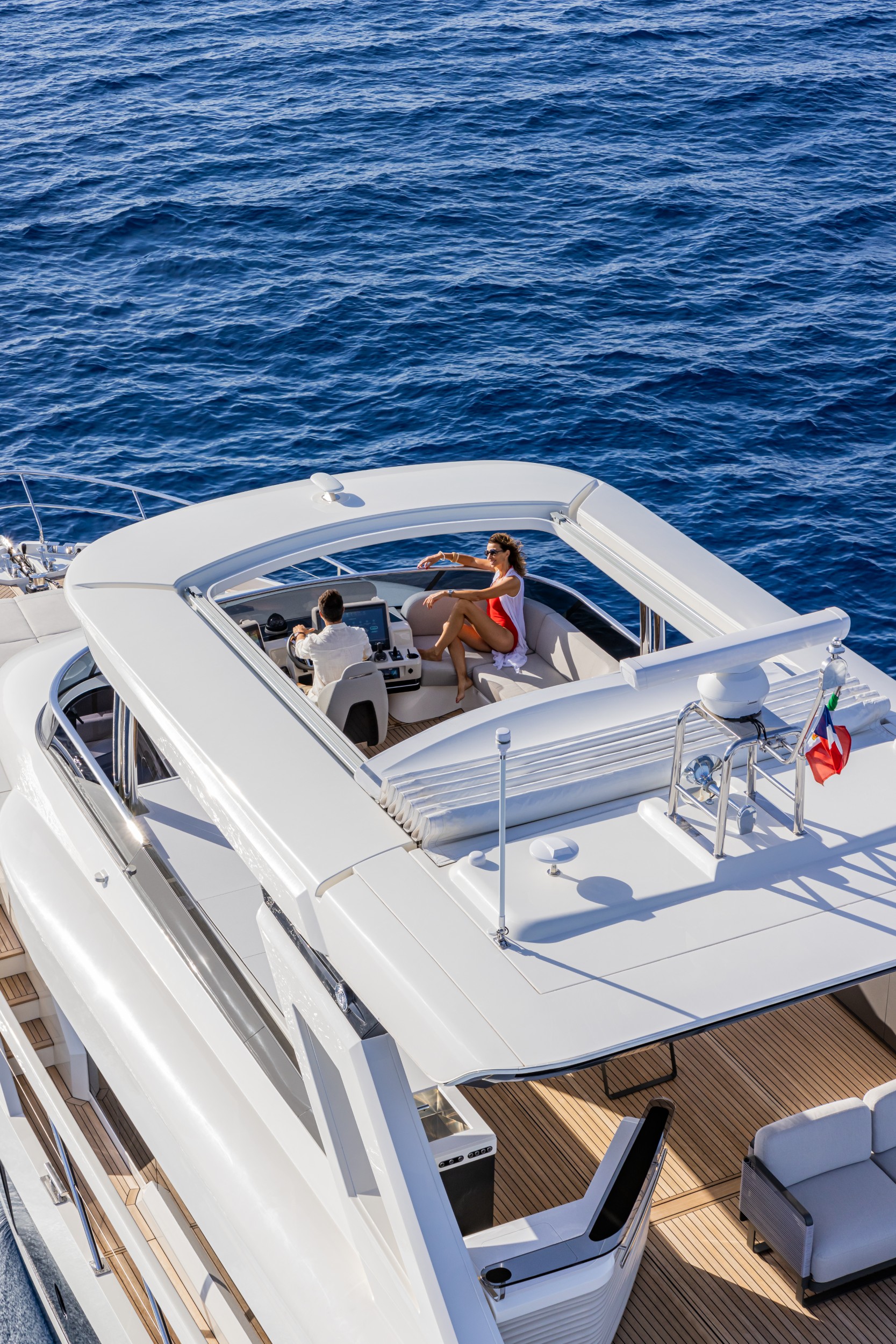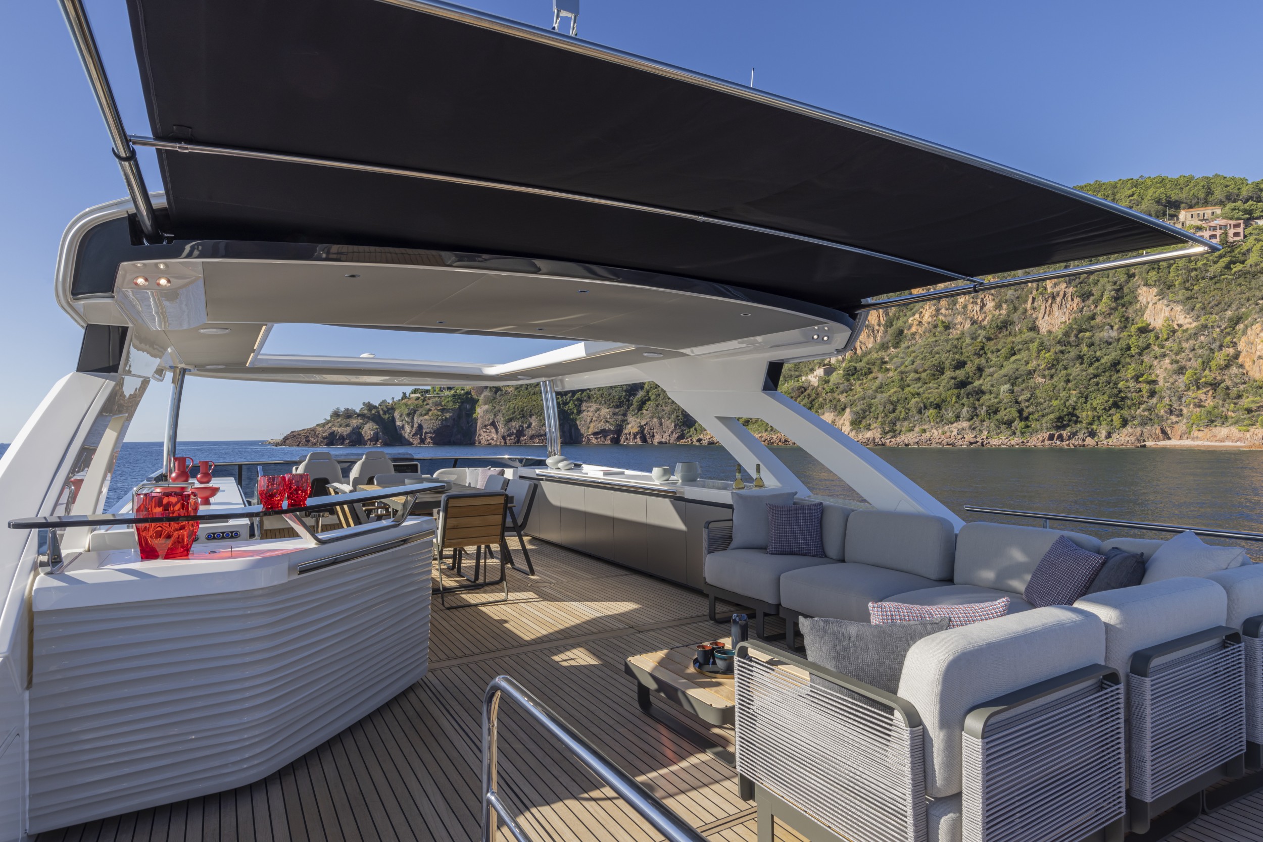 Already a success on Flybridge and Coupé range boats, Navetta 75 also features an aft terrace cockpit with a glass rear parapet; the owner will be able to furnish it as desired to enjoy breathtaking views from here.