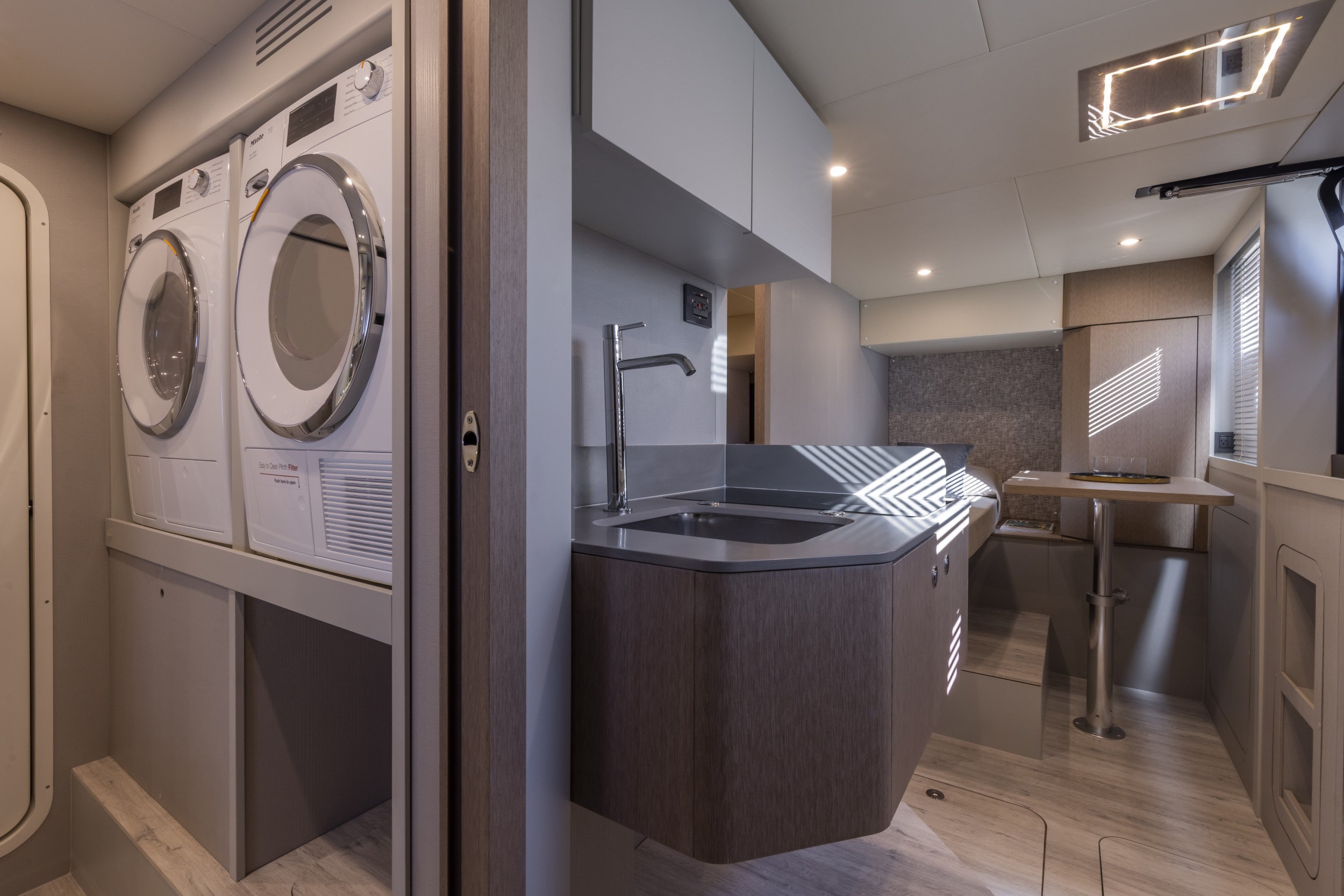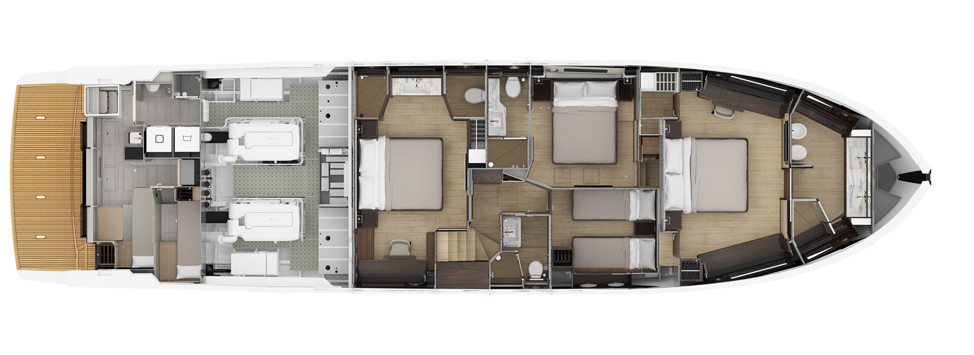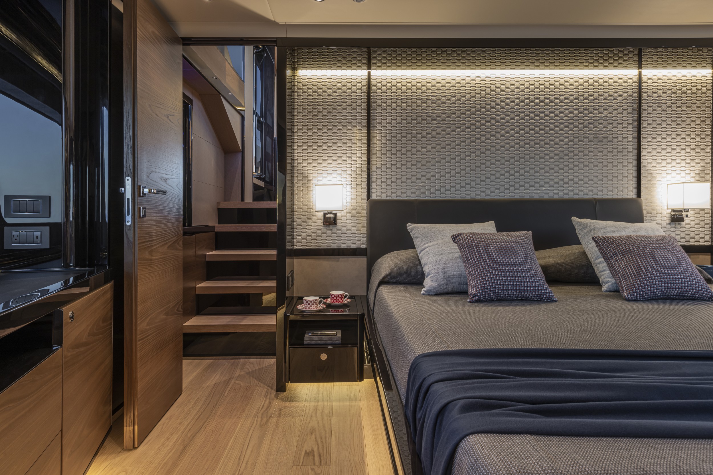 The Navetta 75 features a uniquely positioned forward master suite on its own raised level, complete with private access separate from guest accommodations. This design enhances privacy, reduces noise, and creates a true retreat-like space with impressive headroom, natural light, and panoramic views.