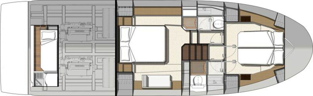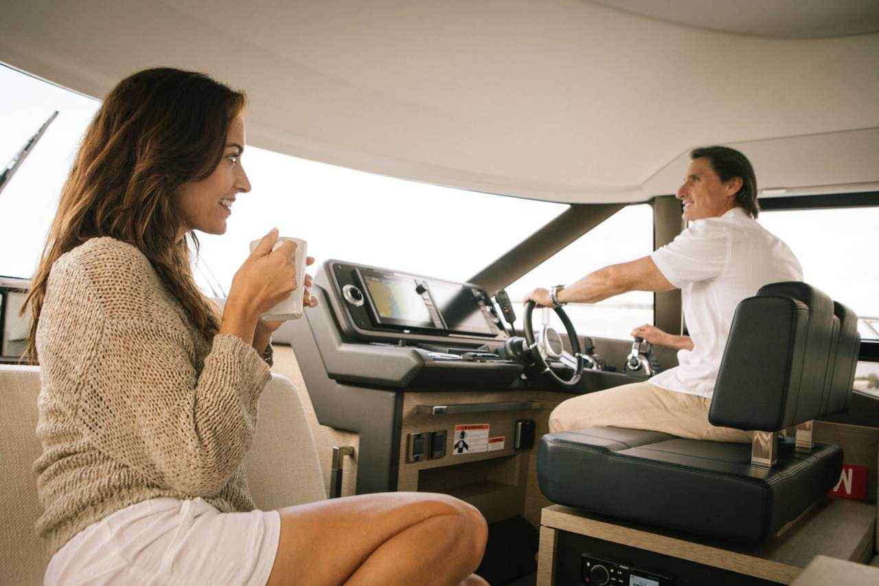 On the exterior, she features the signature style of the latest PRESTIGE Yachts, with an expanded, continuous line of windows in the hull. This Flybridge integrates the concept of the L-shaped cockpit, which allows for maximum use of space. Transformable into a very large aft sundeck, this cockpit can also house a fully equipped skipper cabin.