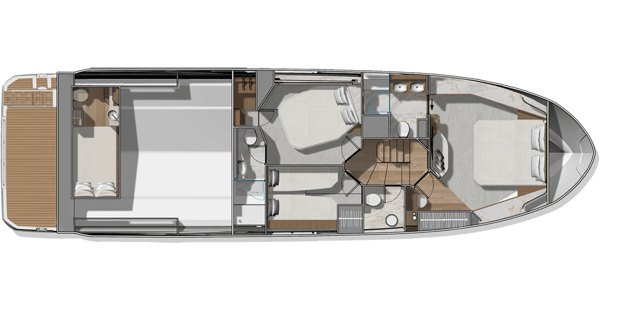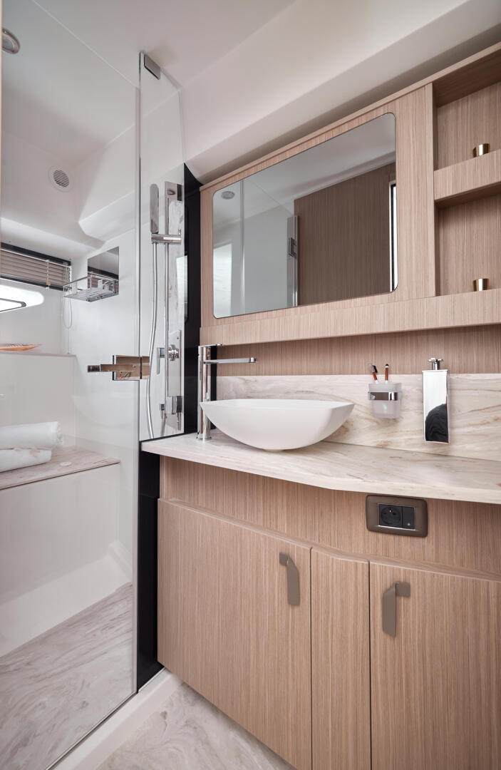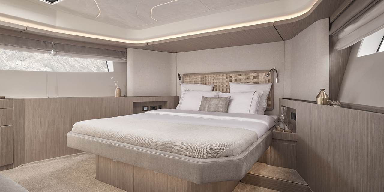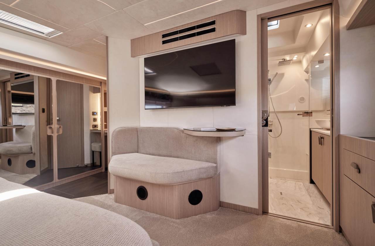 A standout feature of the F5.7 is its forward-positioned owner’s suite, designed as a quiet, private retreat away from guest areas. Featuring a king berth, walk-in closet, and spacious en-suite, it delivers a level of comfort and separation rarely found in this size range.