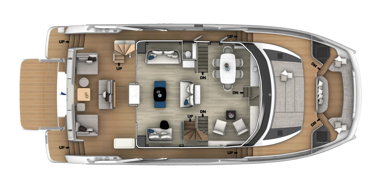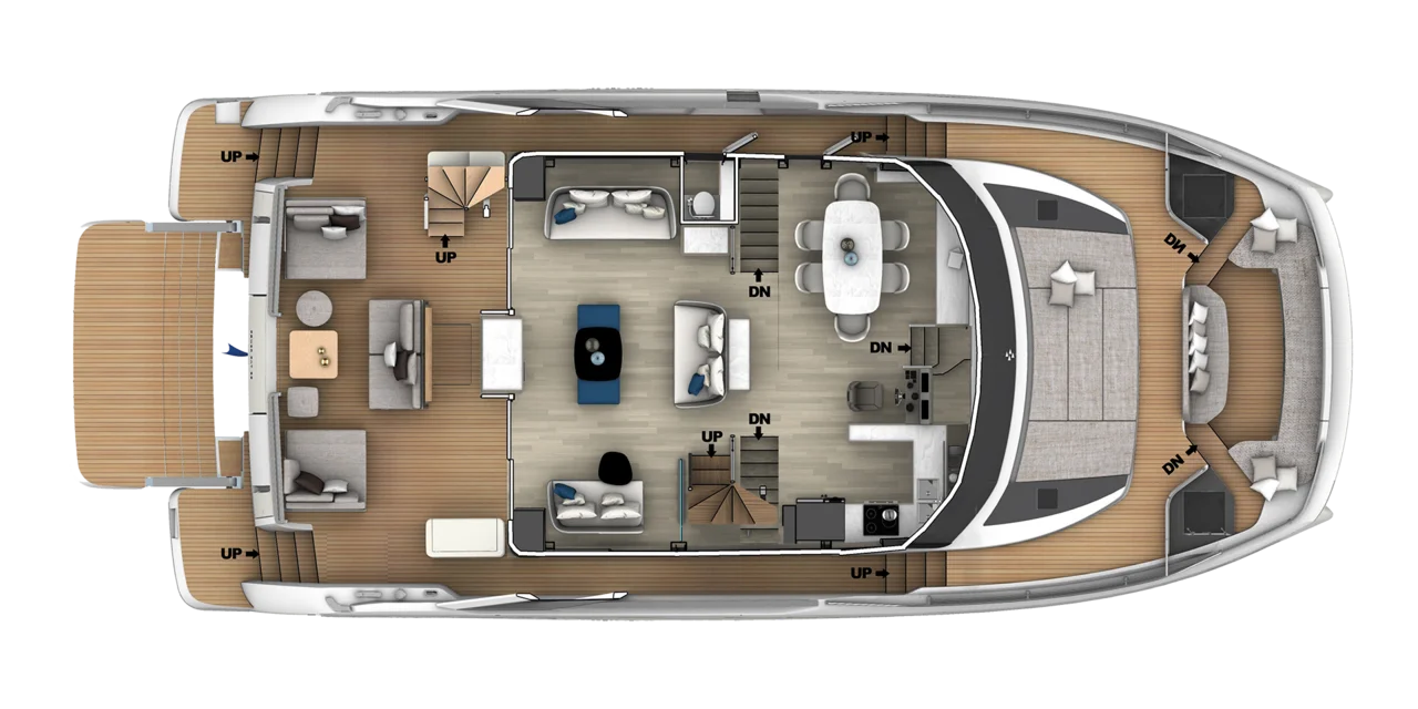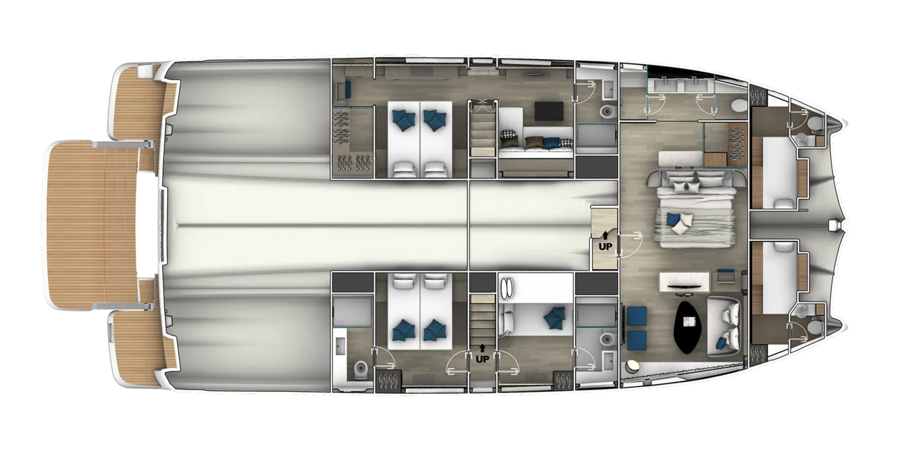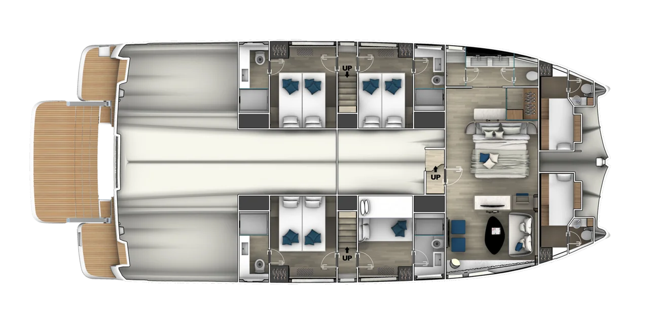 The Prestige M8 delivers interior and exterior living space comparable to an 85-foot monohull thanks to its wide multihull design. Expansive living areas, full-beam layouts, and floor-to-ceiling windows create a true “villa on the water” experience with unmatched openness and comfort.
