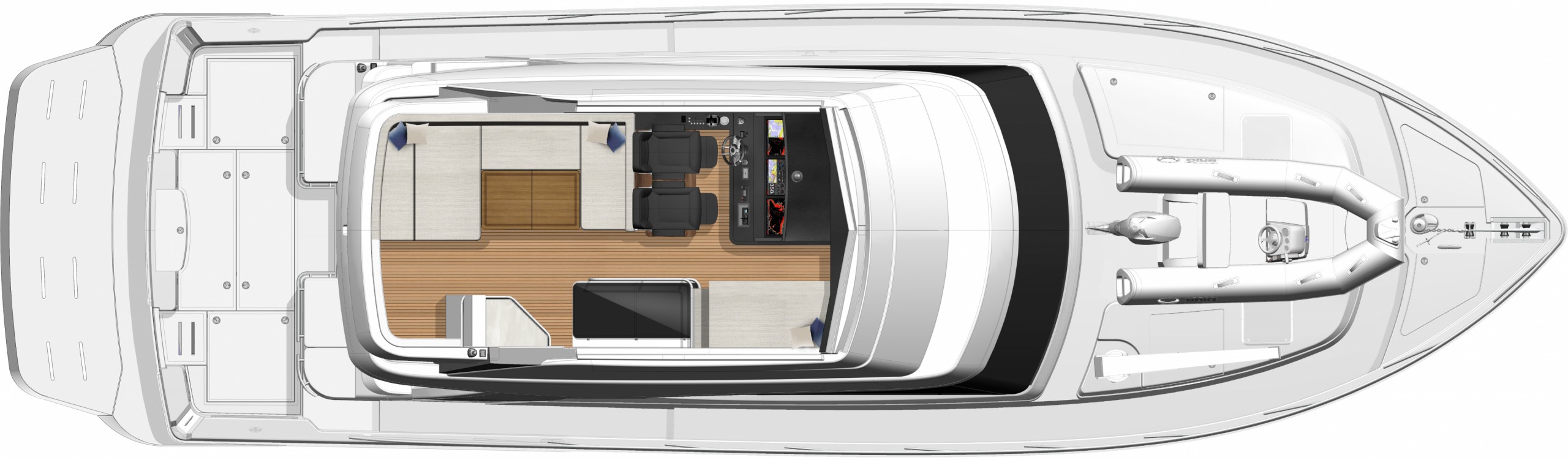 Designed by 4D Designs in collaboration with the Riviera design team and built in-house to our exacting standards on Australia’s Gold Coast, the new 50 Sports Motor Yacht is a remarkable package. Offering all of the essentials you’d expect to find on a much larger yacht, including foredeck relaxation zone, walk-around side decks, all-weather alfresco mezzanine entertaining, spacious luxurious saloon with internal staircase to an enclosed air-conditioned flybridge and state-of-the-art helm. The generous three cabin/two-bathroom accommodation deck is bathed in natural light from tinted glass hull windows and features a magnificent full-beam master stateroom.
