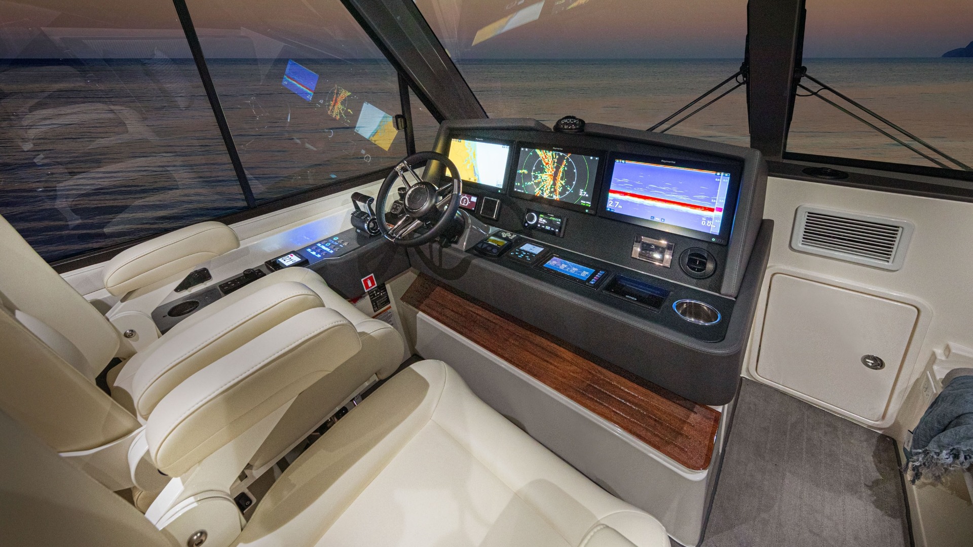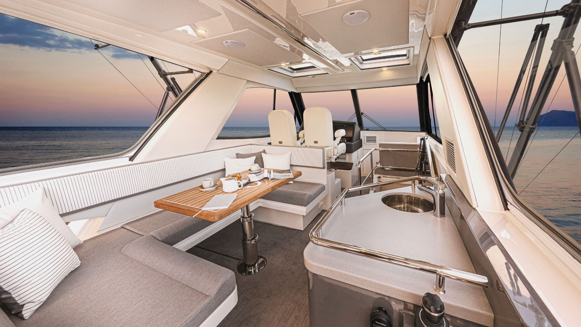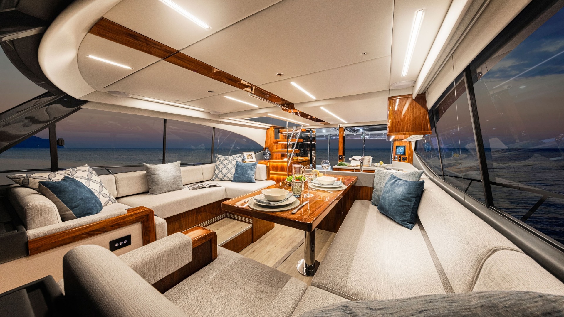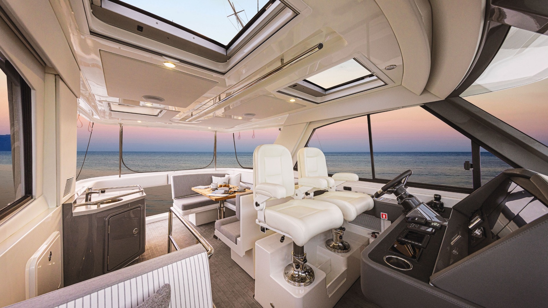 The Riviera 50 Sports Motor Yacht features a fully enclosed, climate-controlled flybridge that functions as a second helm and lounge area. An internal staircase connects it seamlessly to the salon, creating a safer, more refined layout compared to ladder-access designs while enhancing comfort in any weather.