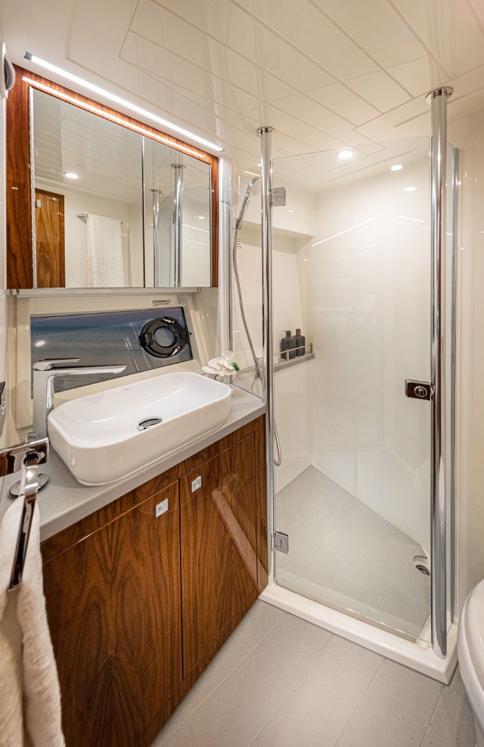 Designed for extended cruising, the 50 SMY offers a spacious three-cabin, two-bathroom layout highlighted by a full-beam master suite. Large hull windows bring in natural light, creating a bright, open feel that delivers the comfort and livability of a much larger yacht.
