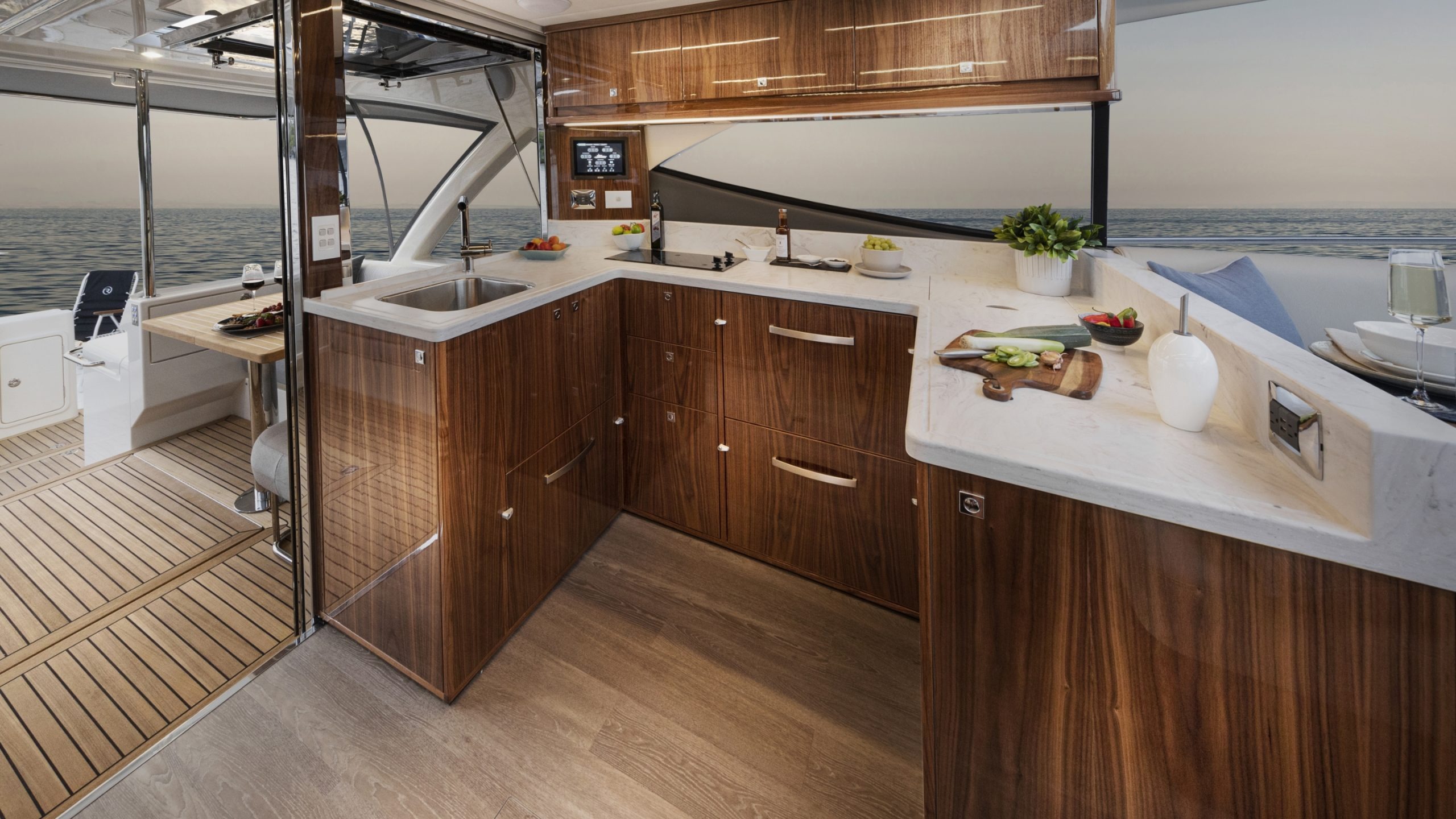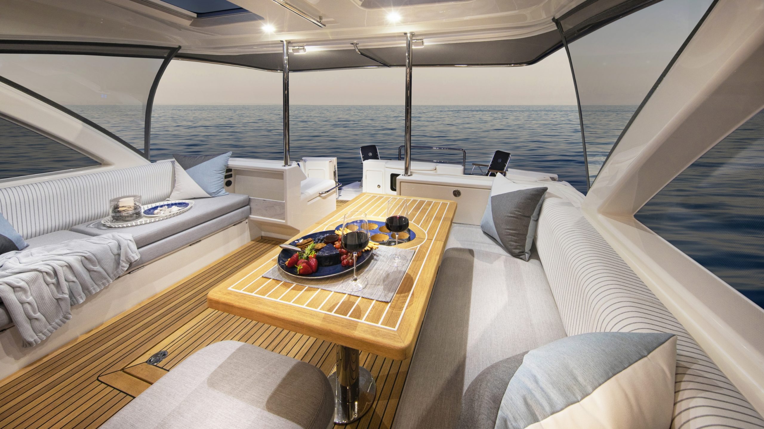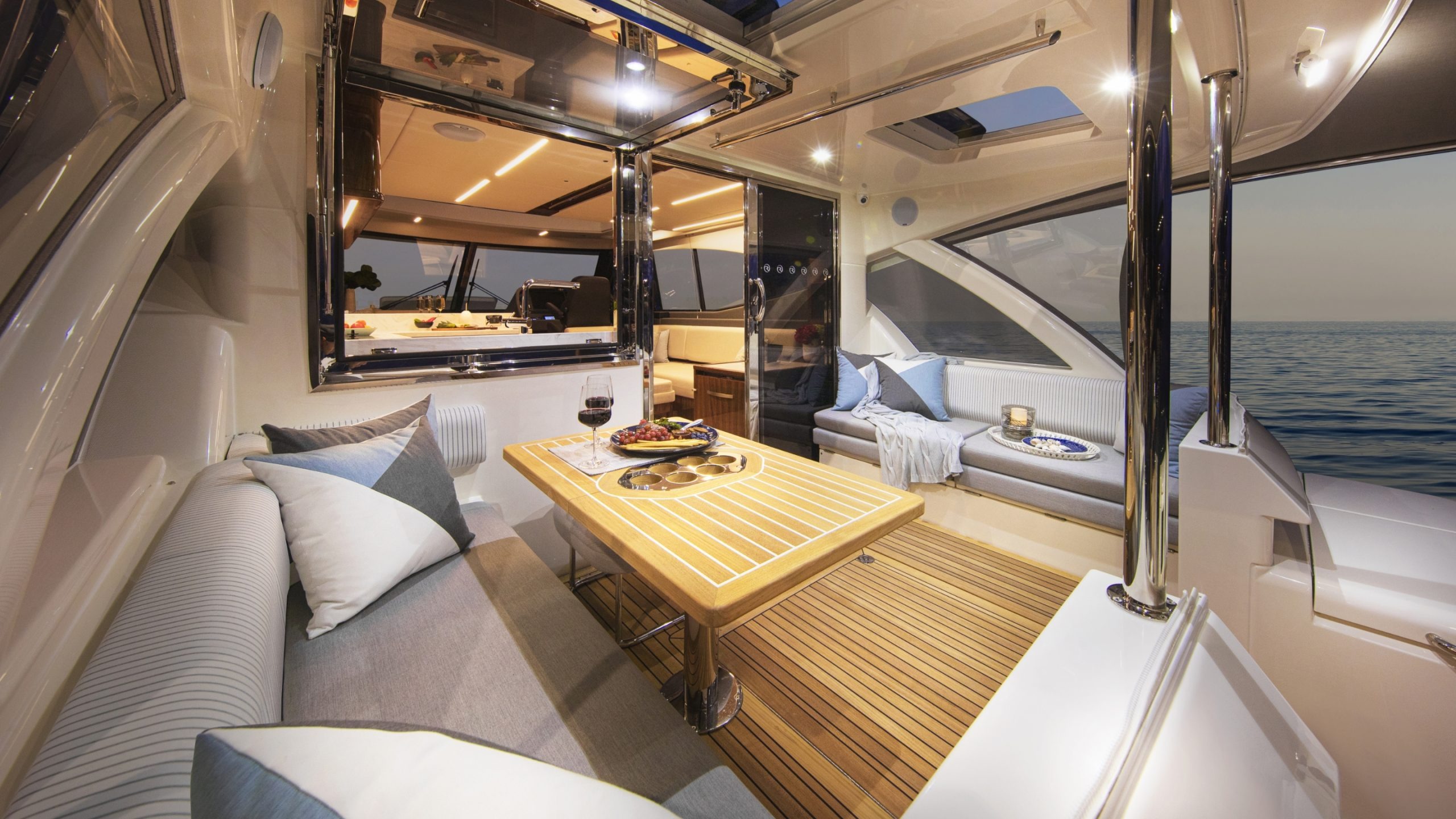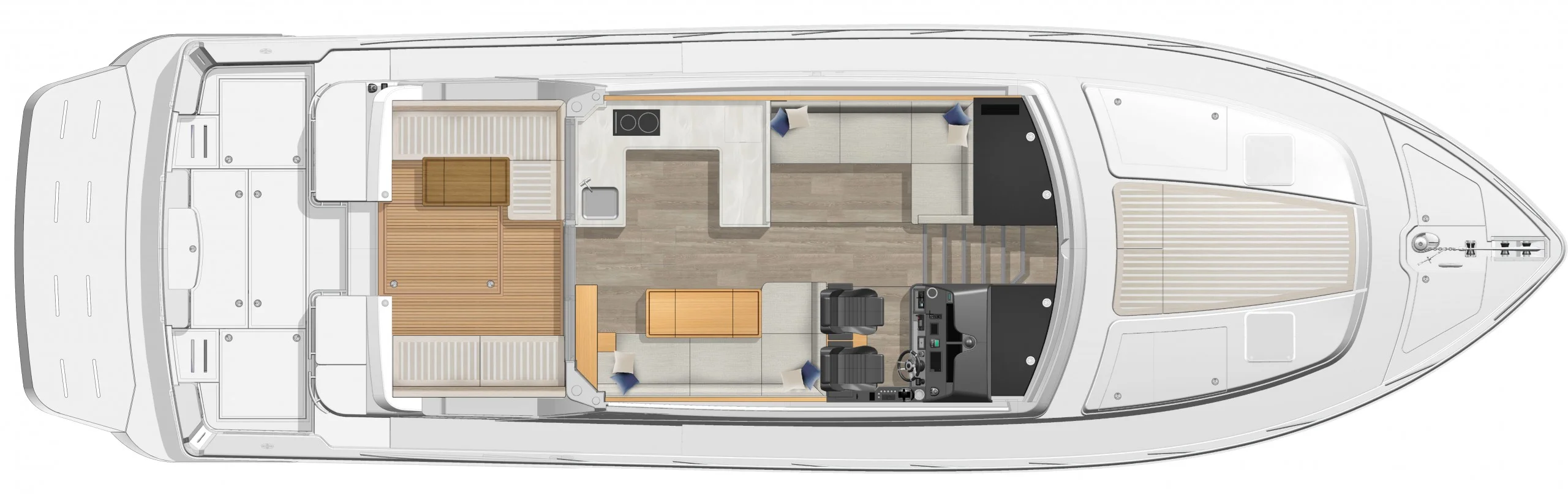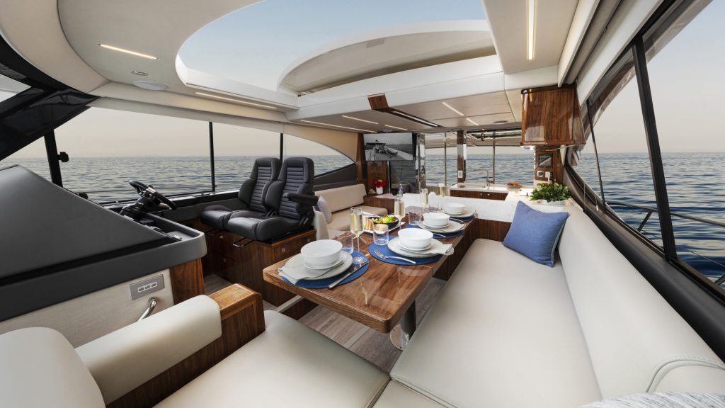 A standout feature of the Riviera 505 SUV is its elevated mezzanine lounge, offering a protected, comfortable space for dining and relaxing just above the cockpit. This unique design adds a second social zone while maintaining a strong connection to the water, creating a versatile entertaining environment in any conditions.