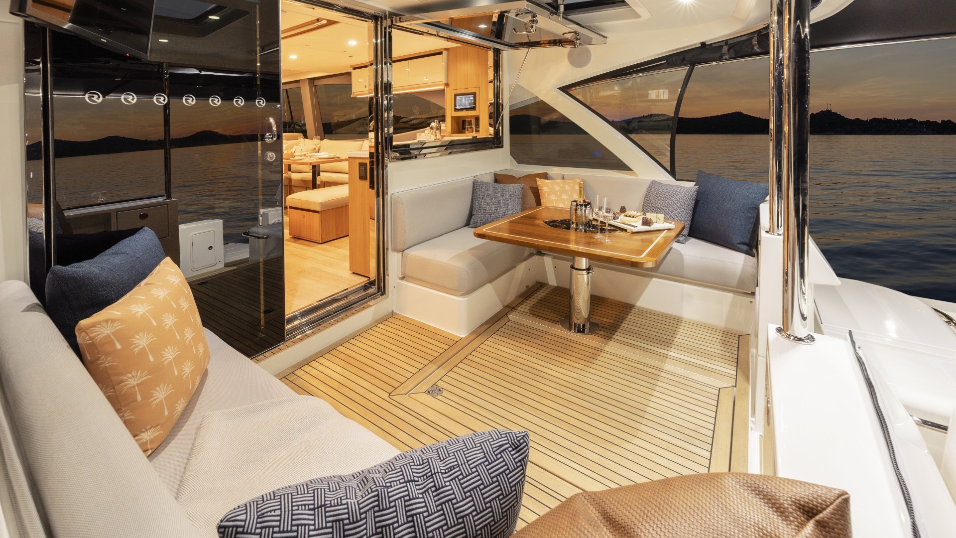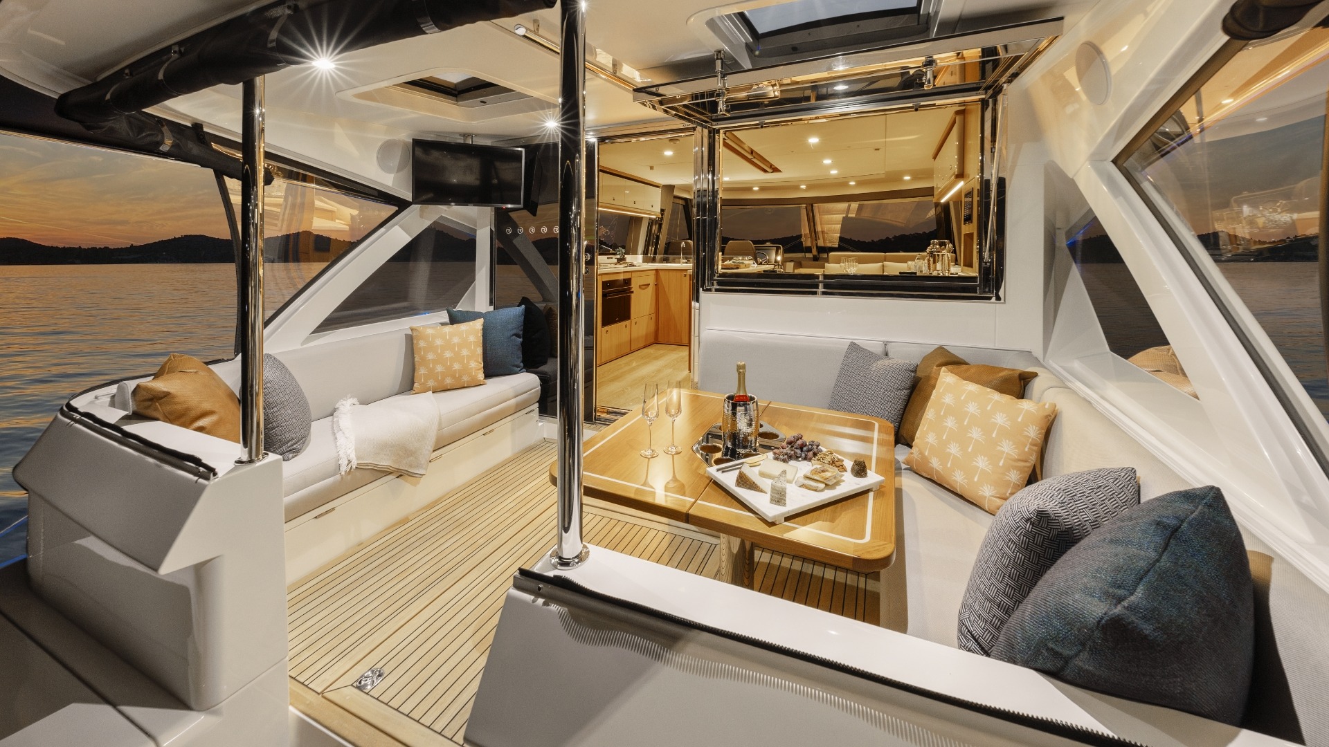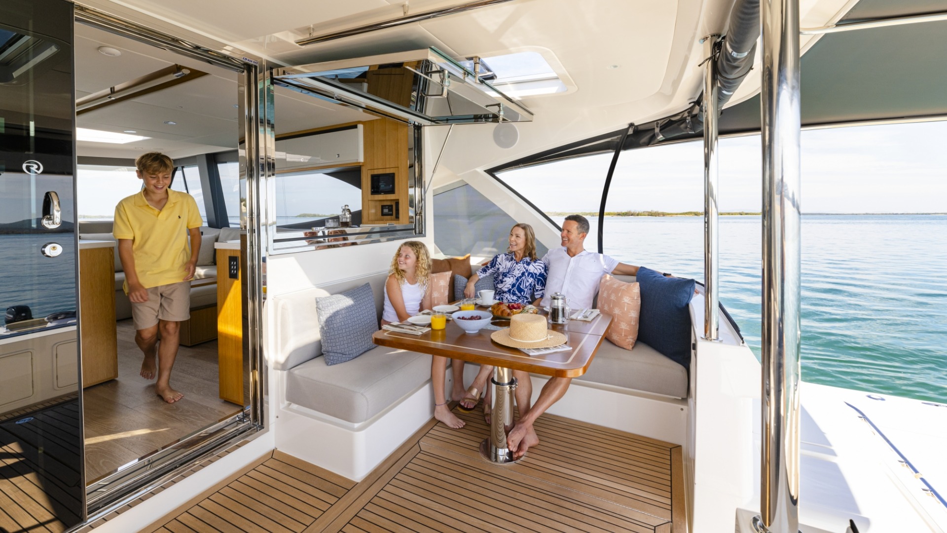A signature feature of the 585 SUV is its raised, semi-enclosed alfresco deck that effectively extends the salon into an additional lounge and dining area. With opening windows, sliding doors, and dual sunroofs, it creates a flexible indoor-outdoor space that can be fully enclosed or opened to the elements.