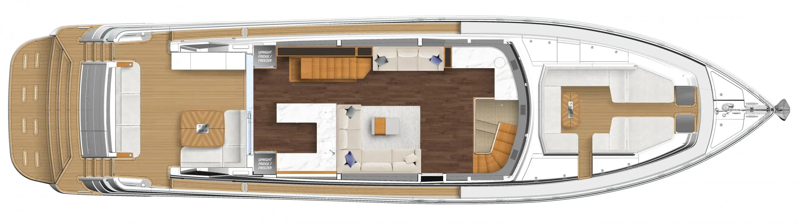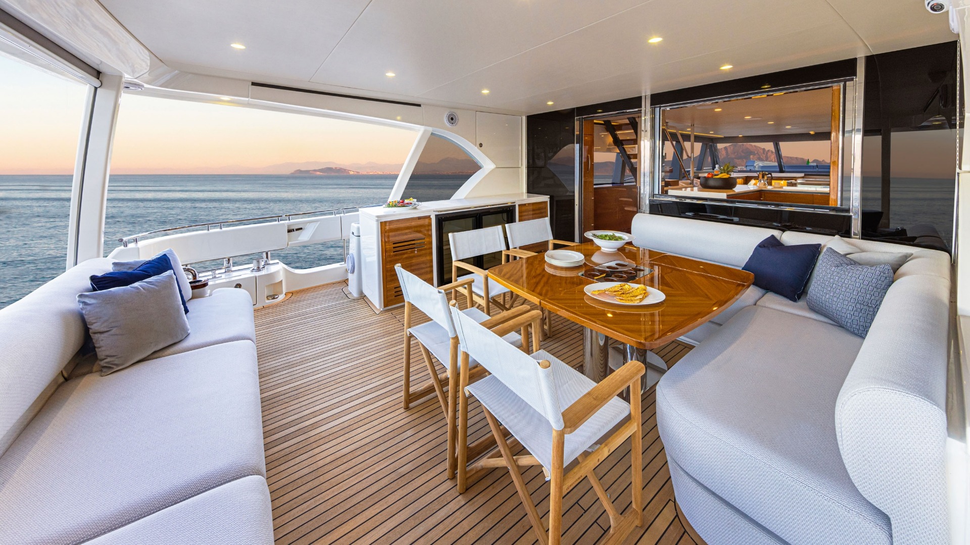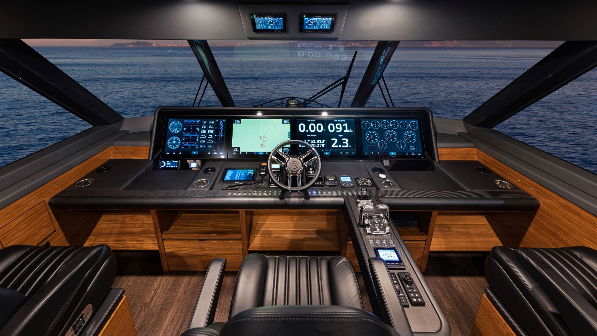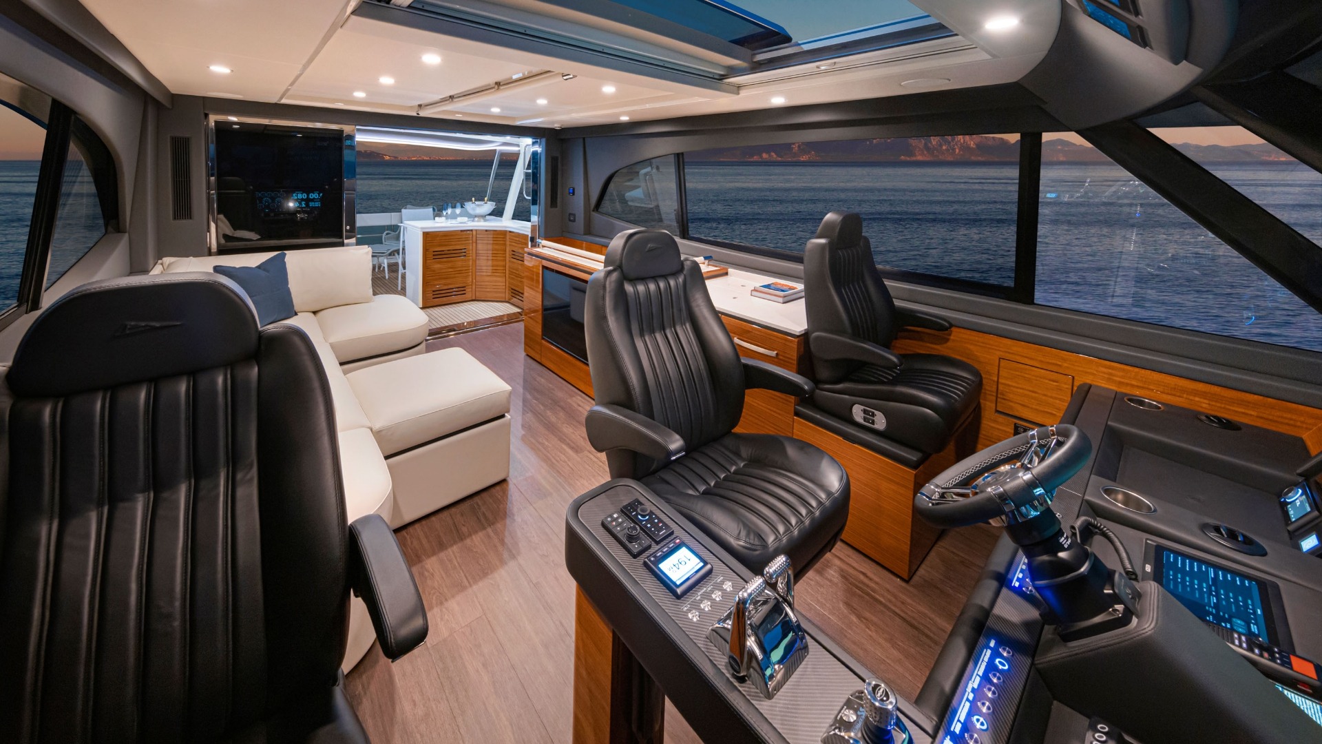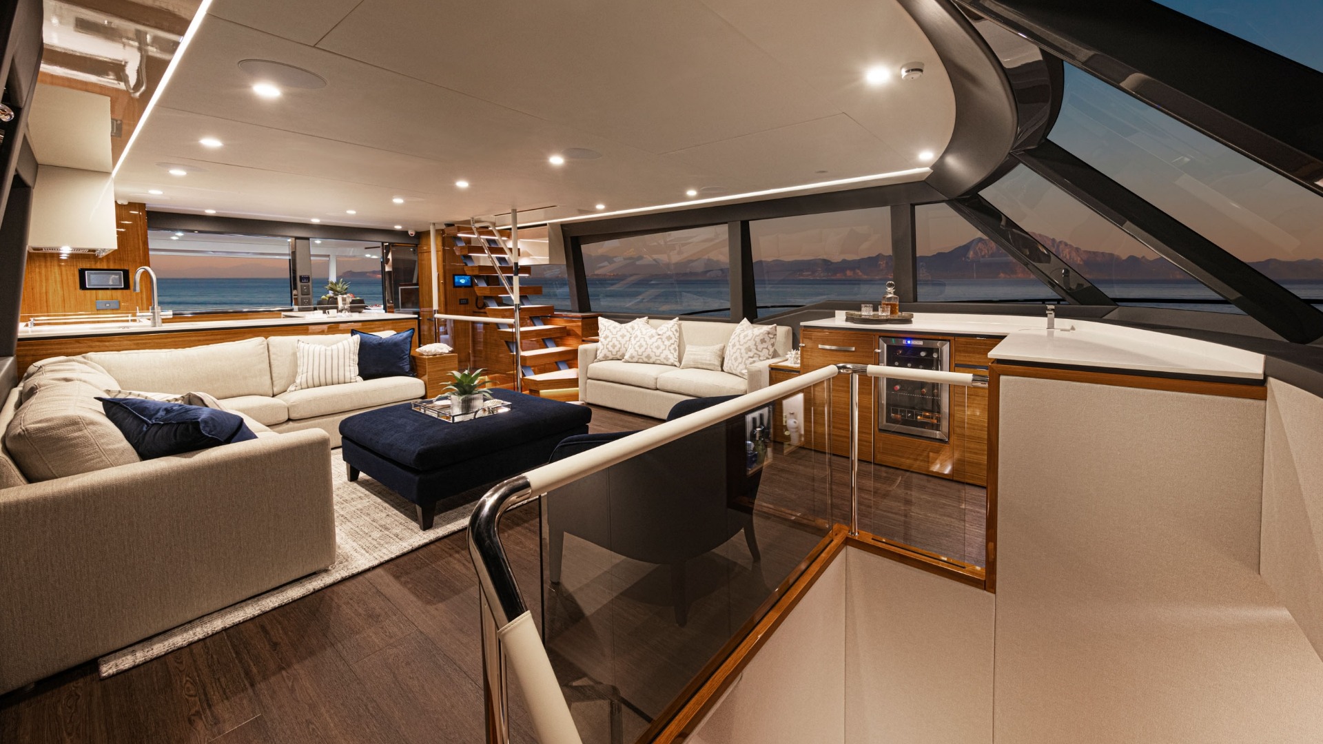 The fully enclosed bridge deck transforms into a climate-controlled upper lounge, effectively creating a second salon with its own helm and seating area. An internal staircase connects the levels, allowing for easy movement while keeping everything protected and comfortable in any weather.