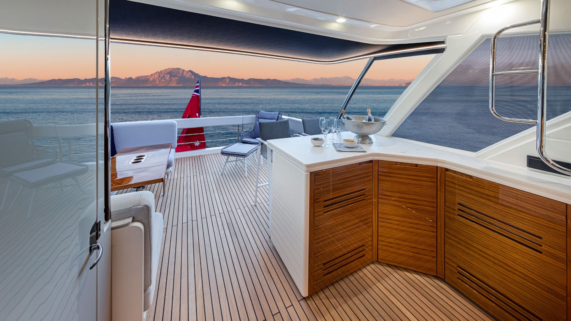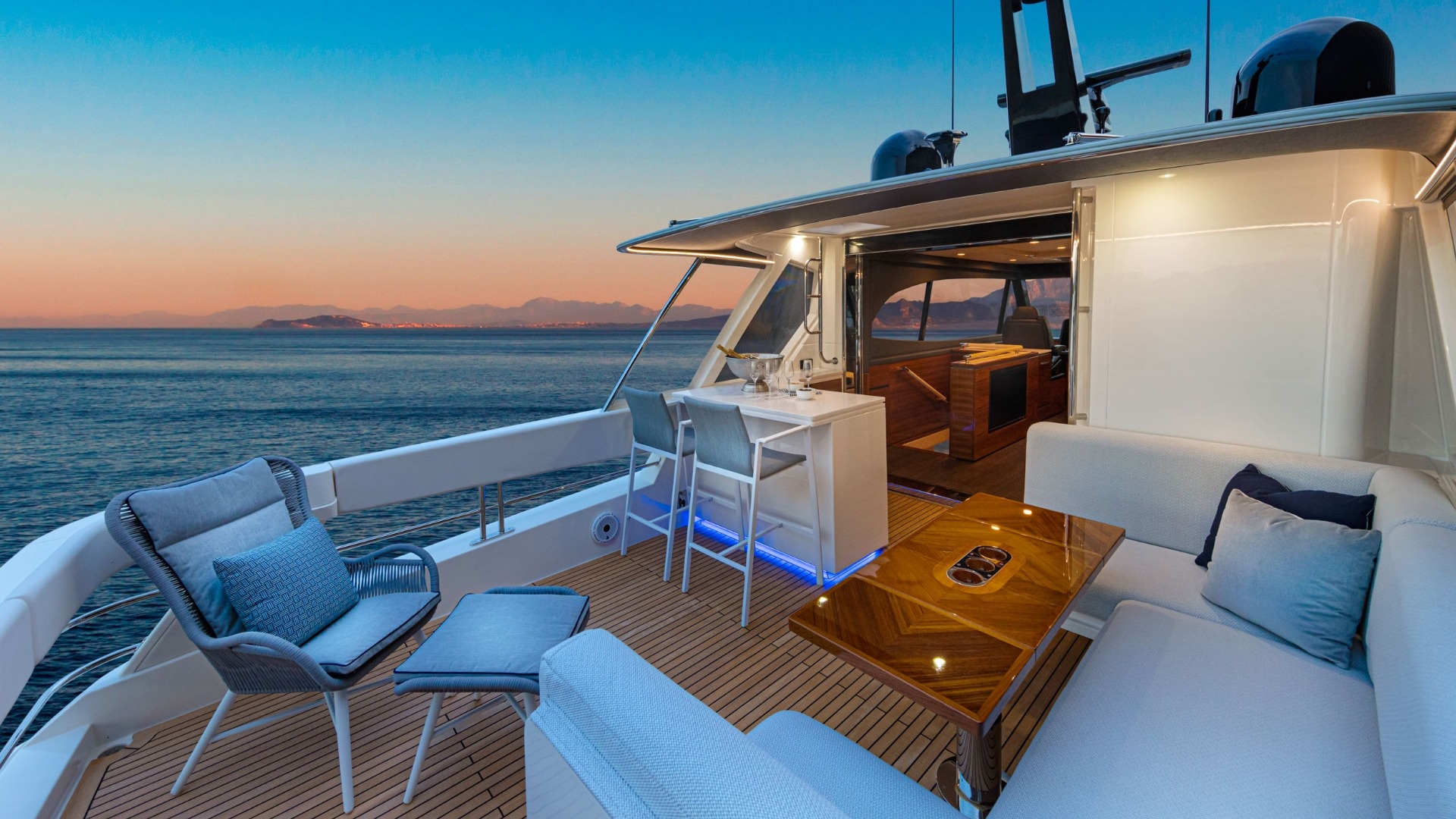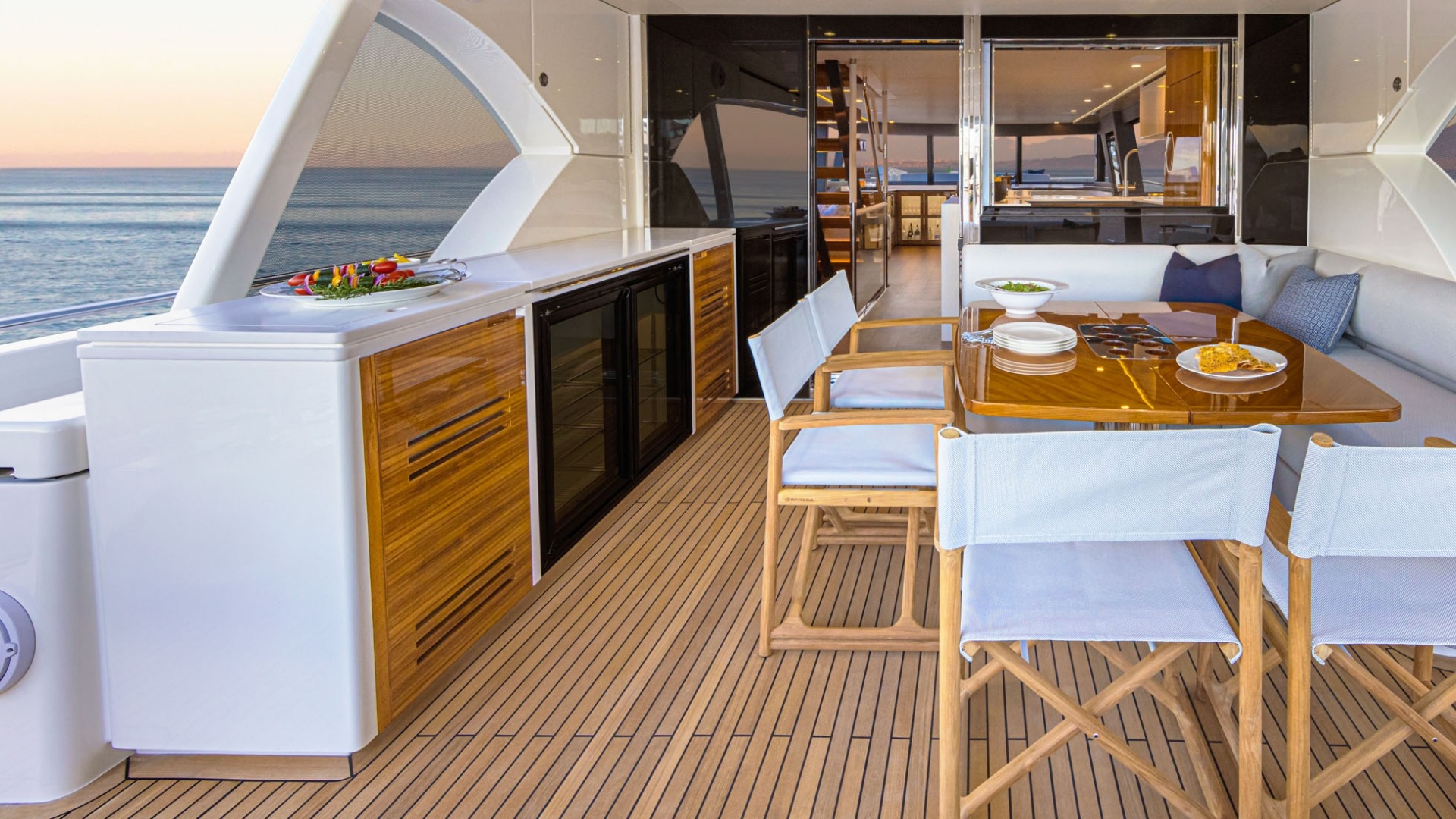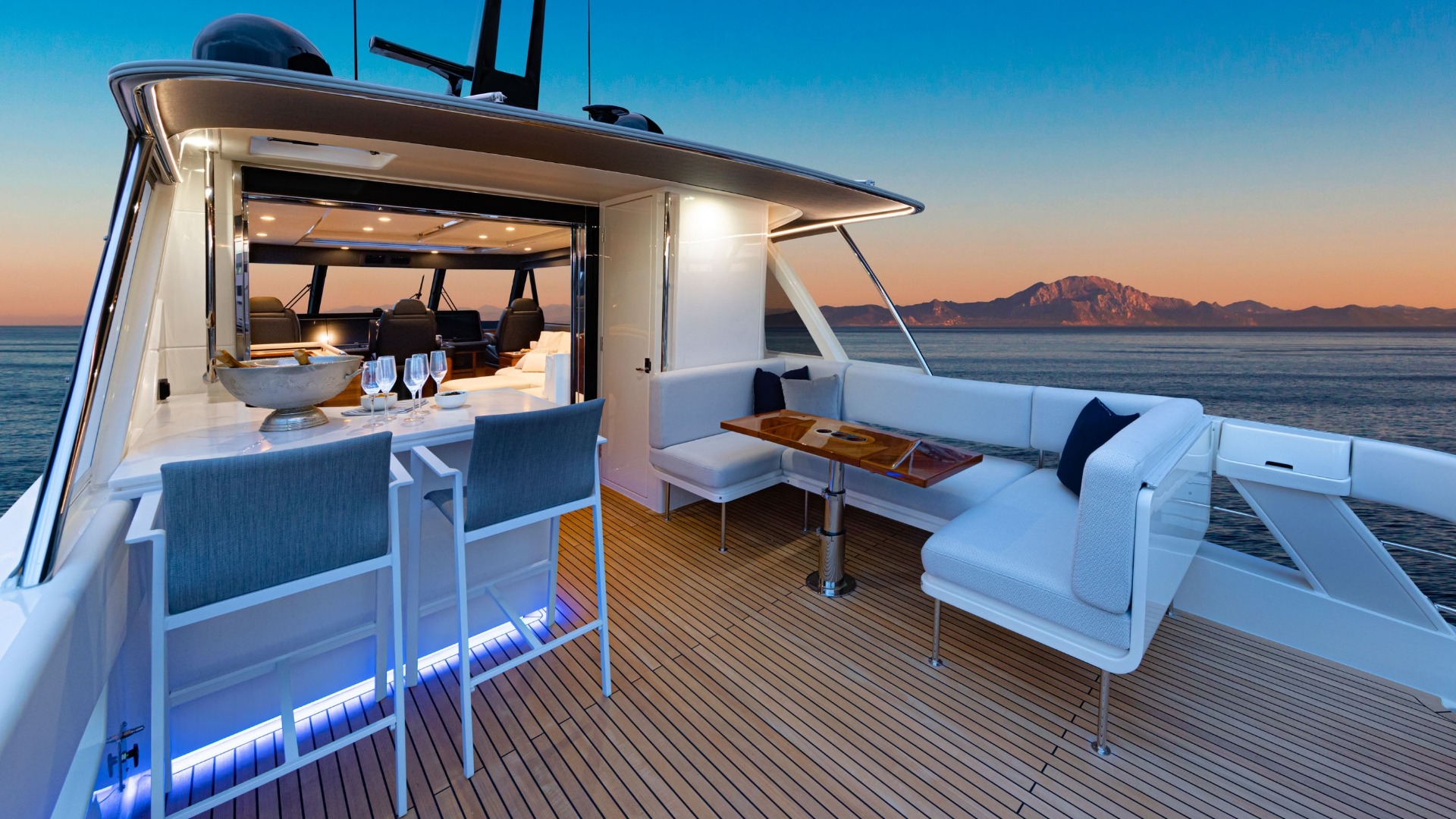 The fully enclosed bridge deck transforms into a climate-controlled upper lounge, effectively creating a second salon with its own helm and seating area. An internal staircase connects the levels, allowing for easy movement while keeping everything protected and comfortable in any weather.