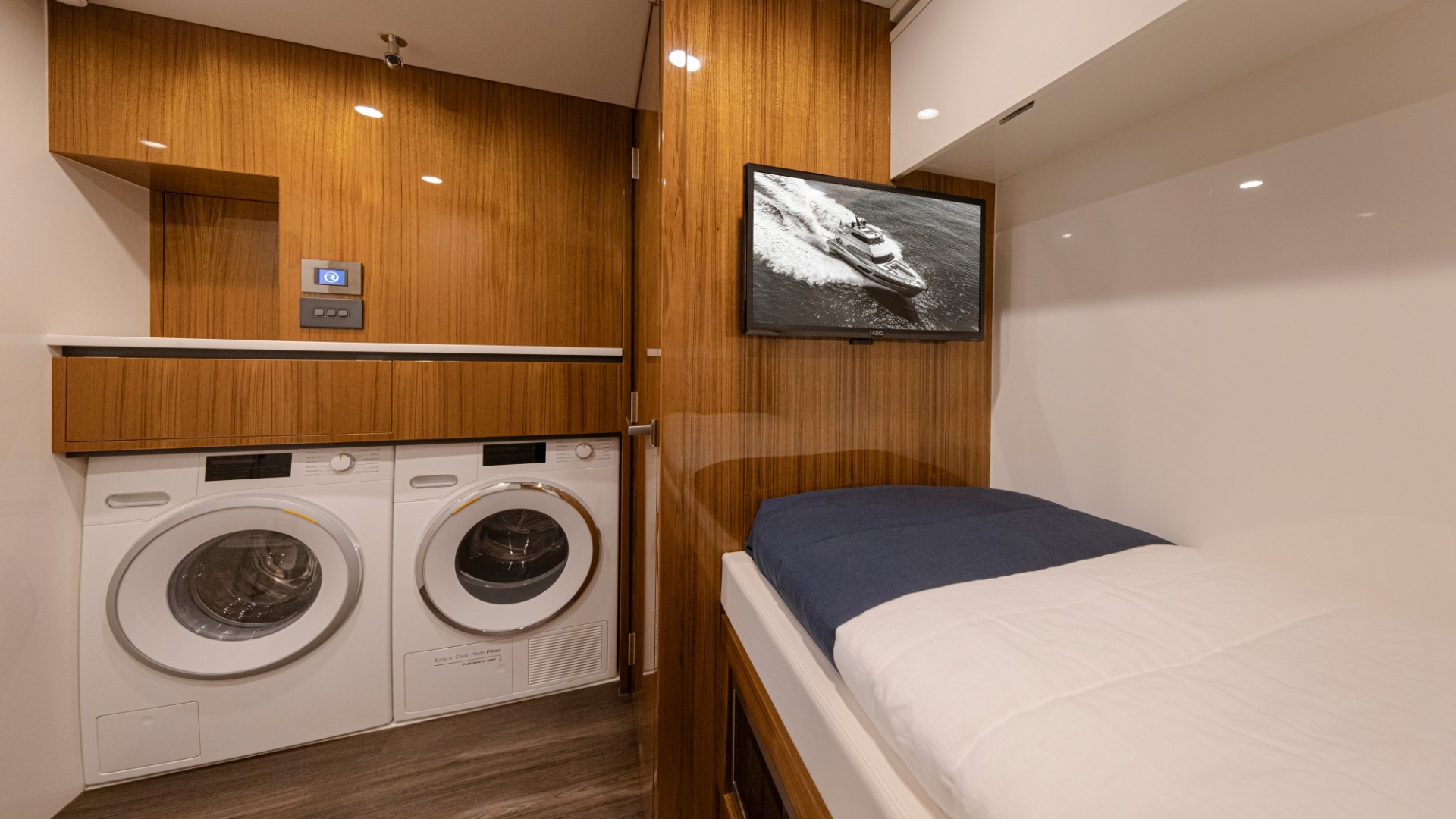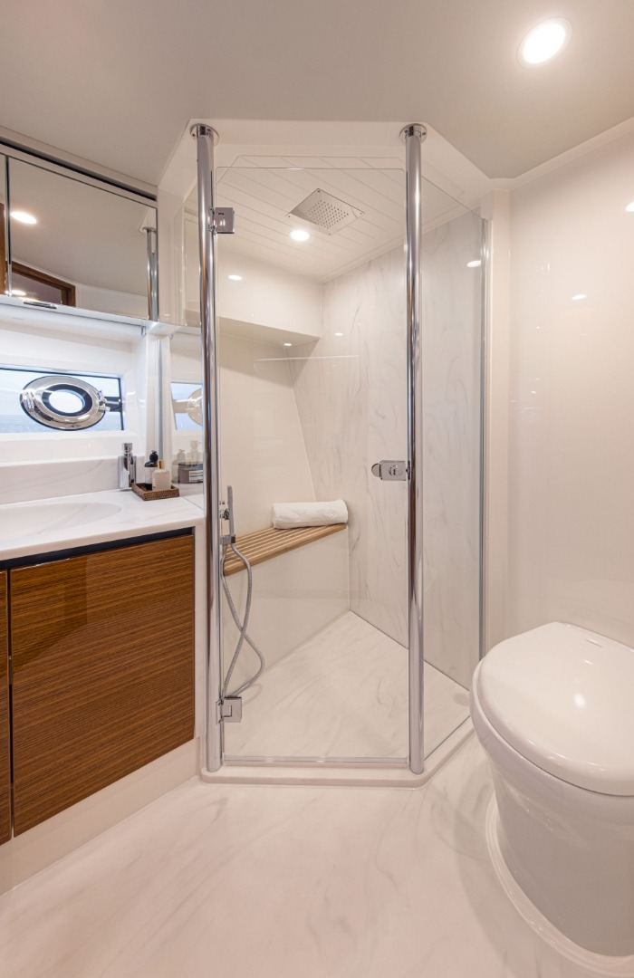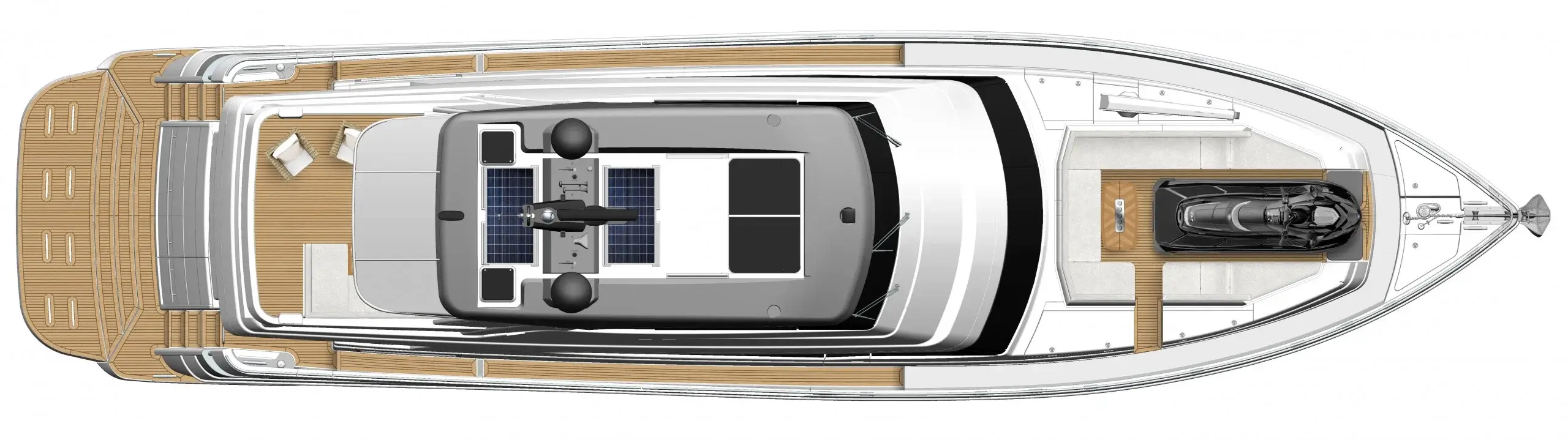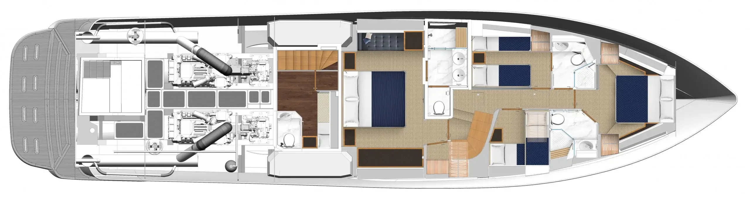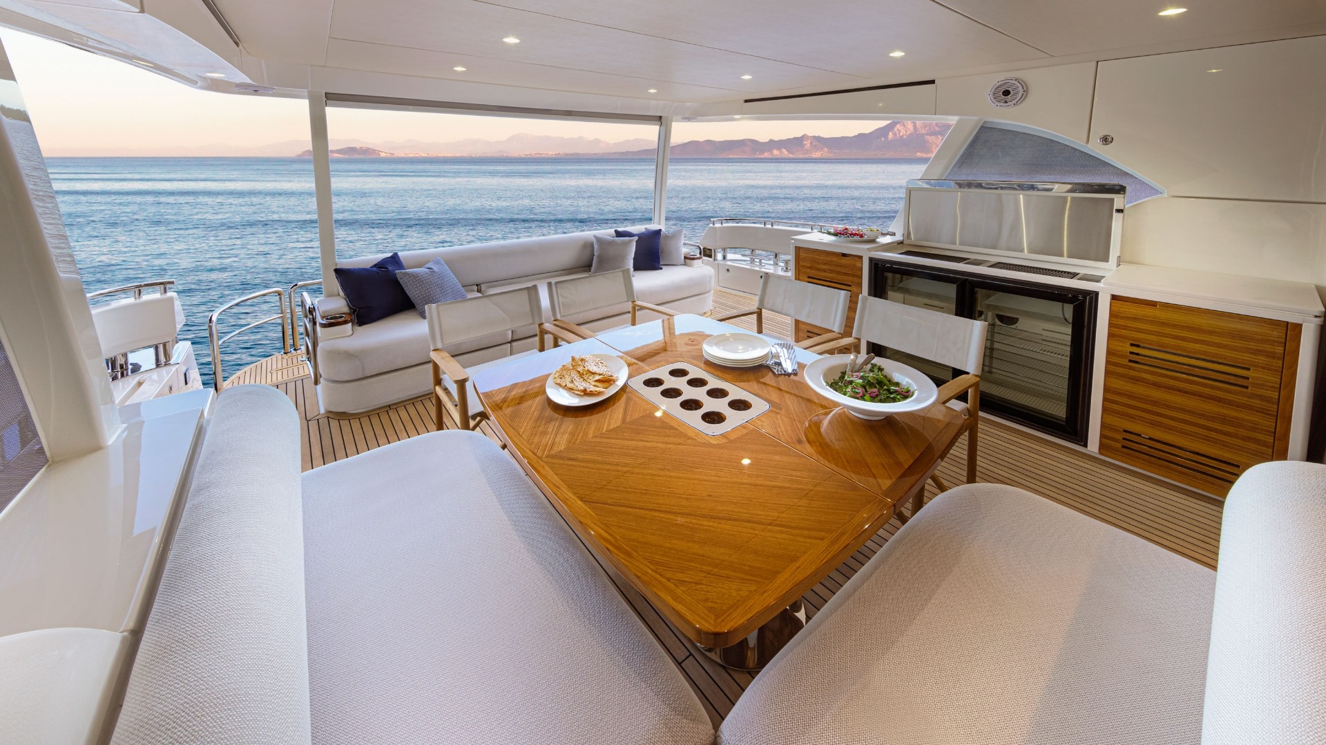 The fully enclosed bridge deck transforms into a climate-controlled upper lounge, effectively creating a second salon with its own helm and seating area. An internal staircase connects the levels, allowing for easy movement while keeping everything protected and comfortable in any weather.