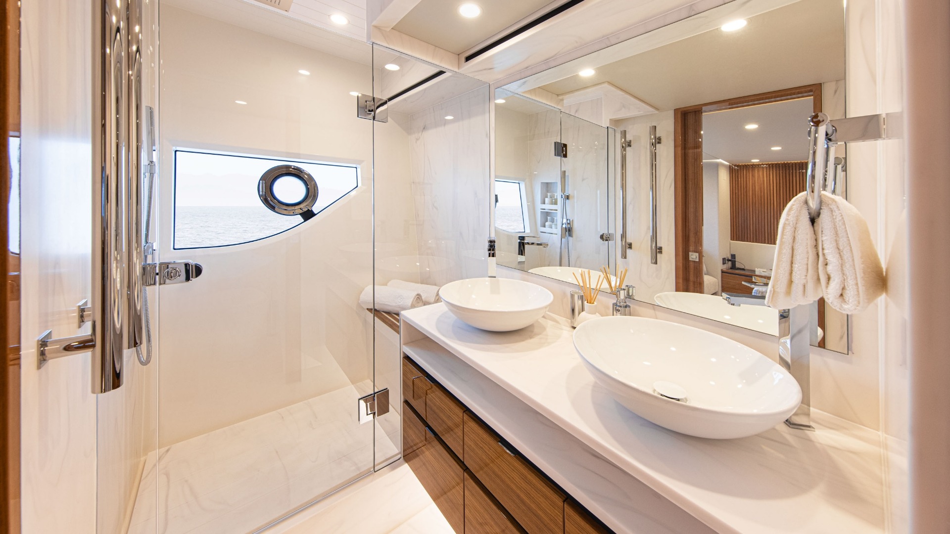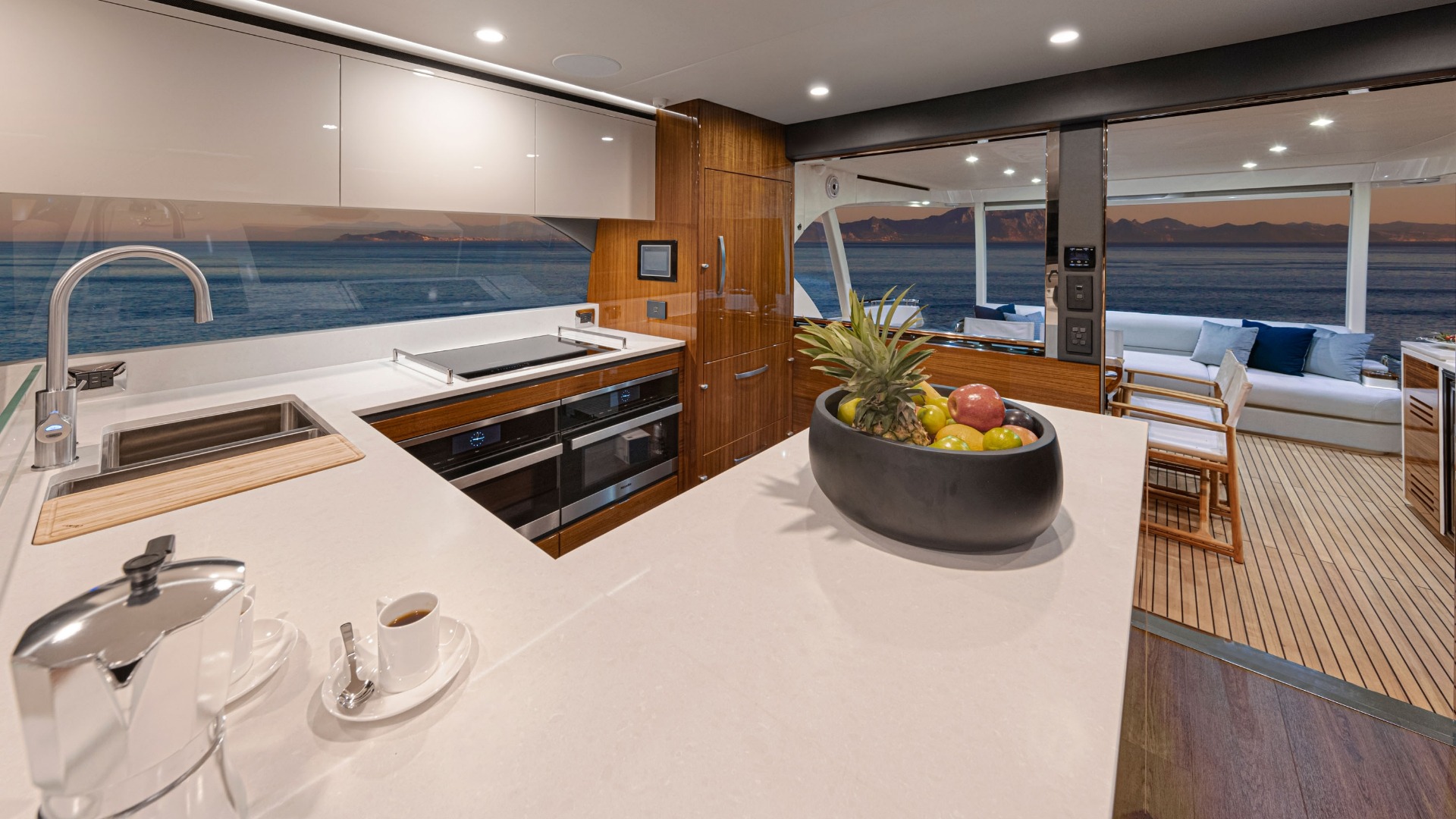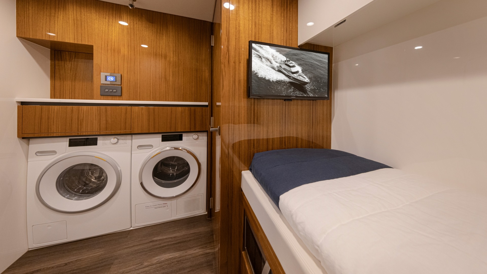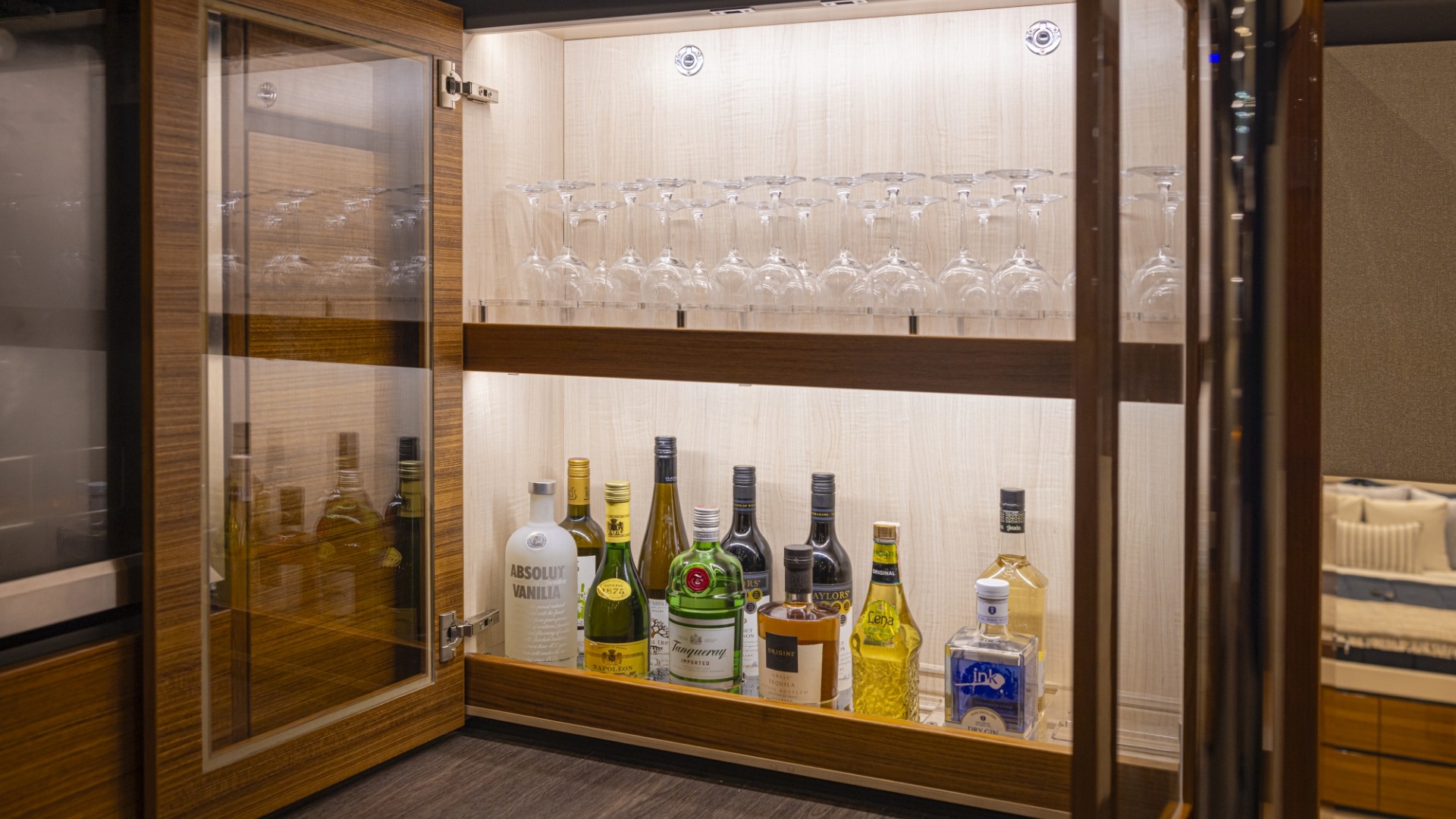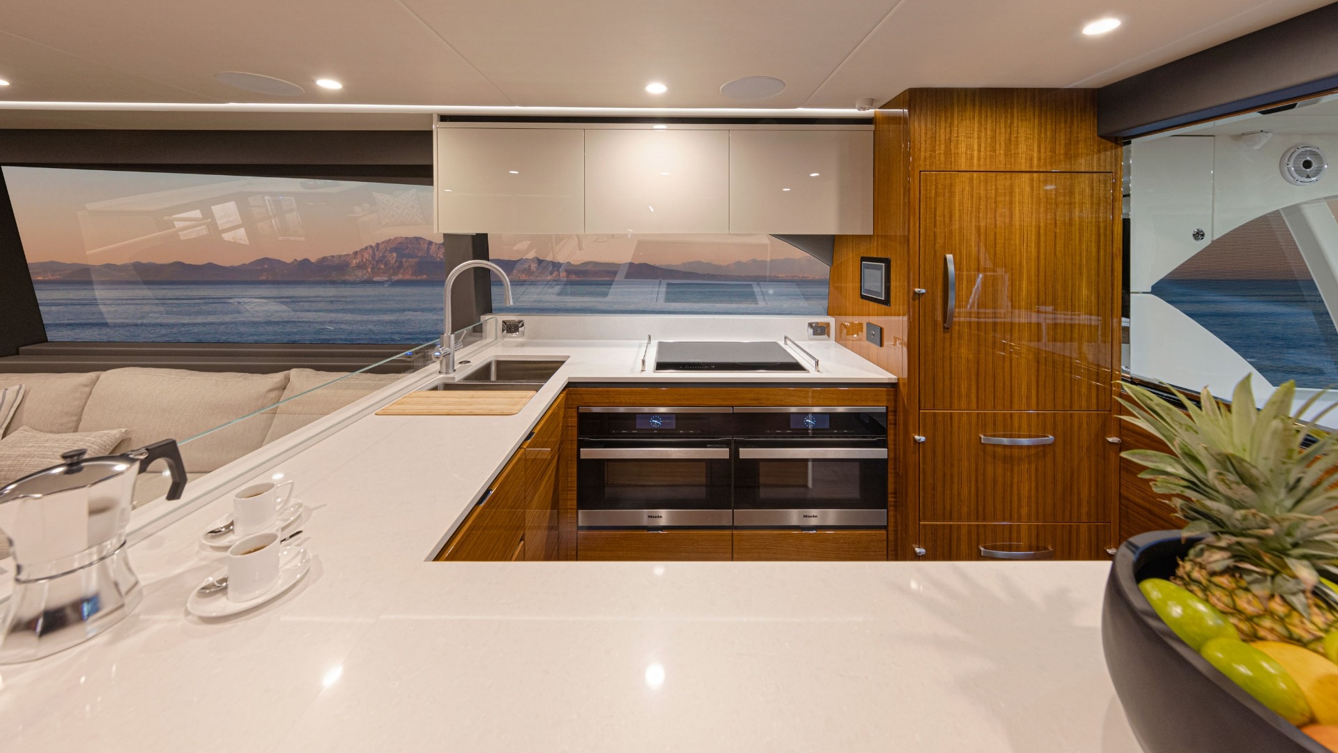 The fully enclosed bridge deck transforms into a climate-controlled upper lounge, effectively creating a second salon with its own helm and seating area. An internal staircase connects the levels, allowing for easy movement while keeping everything protected and comfortable in any weather.