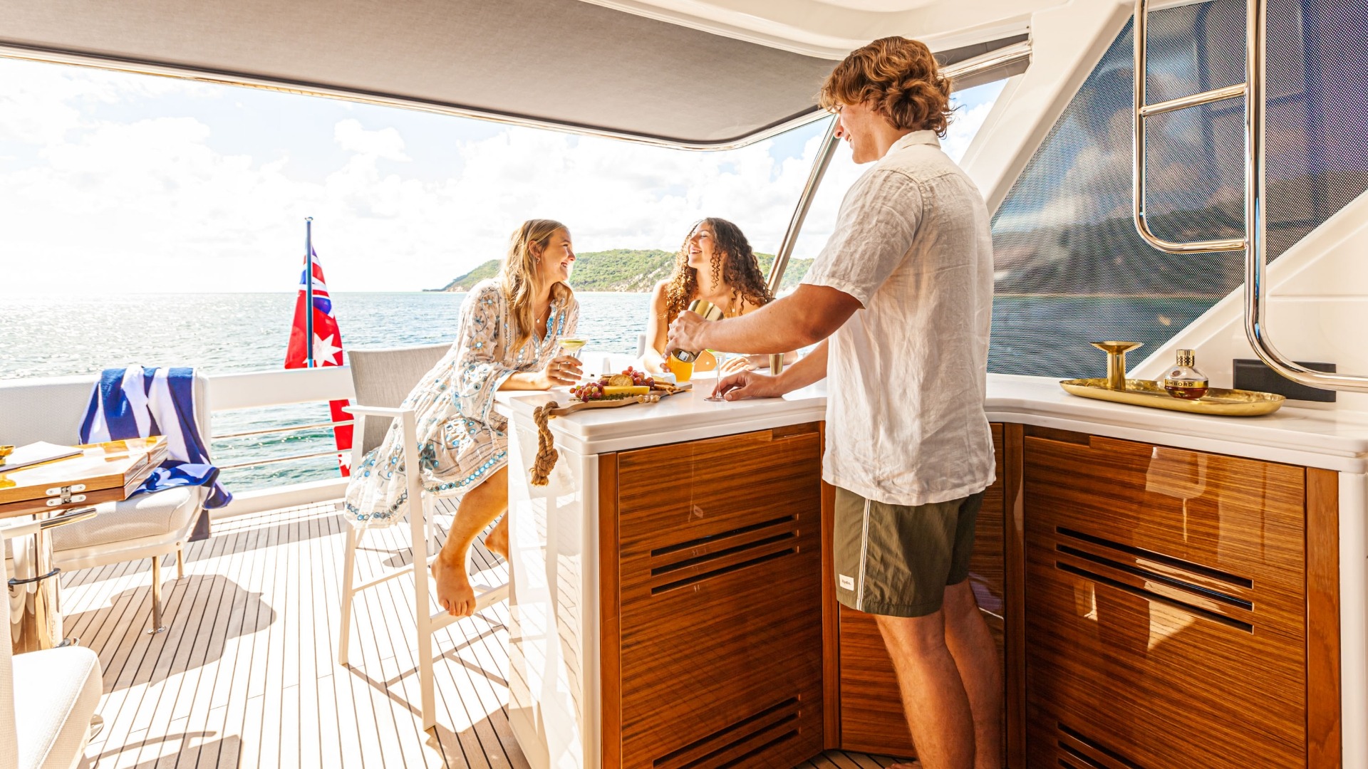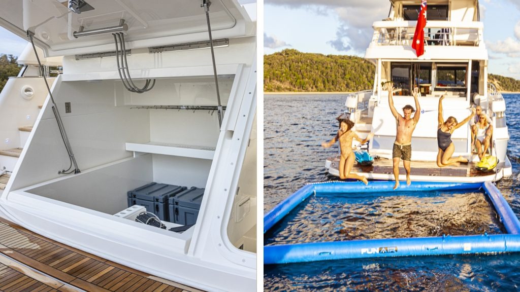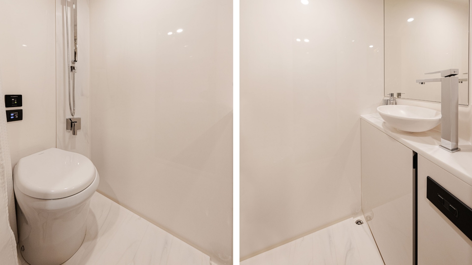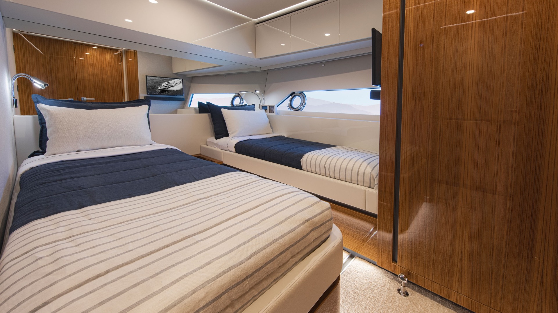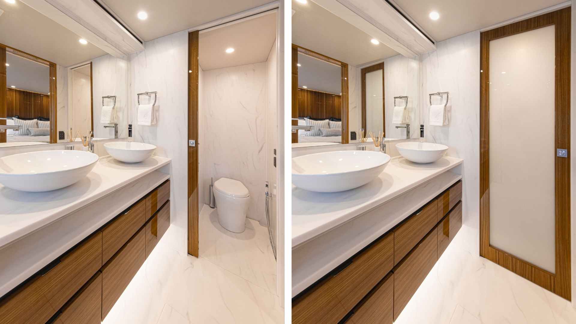 The fully enclosed bridge deck transforms into a climate-controlled upper lounge, effectively creating a second salon with its own helm and seating area. An internal staircase connects the levels, allowing for easy movement while keeping everything protected and comfortable in any weather.