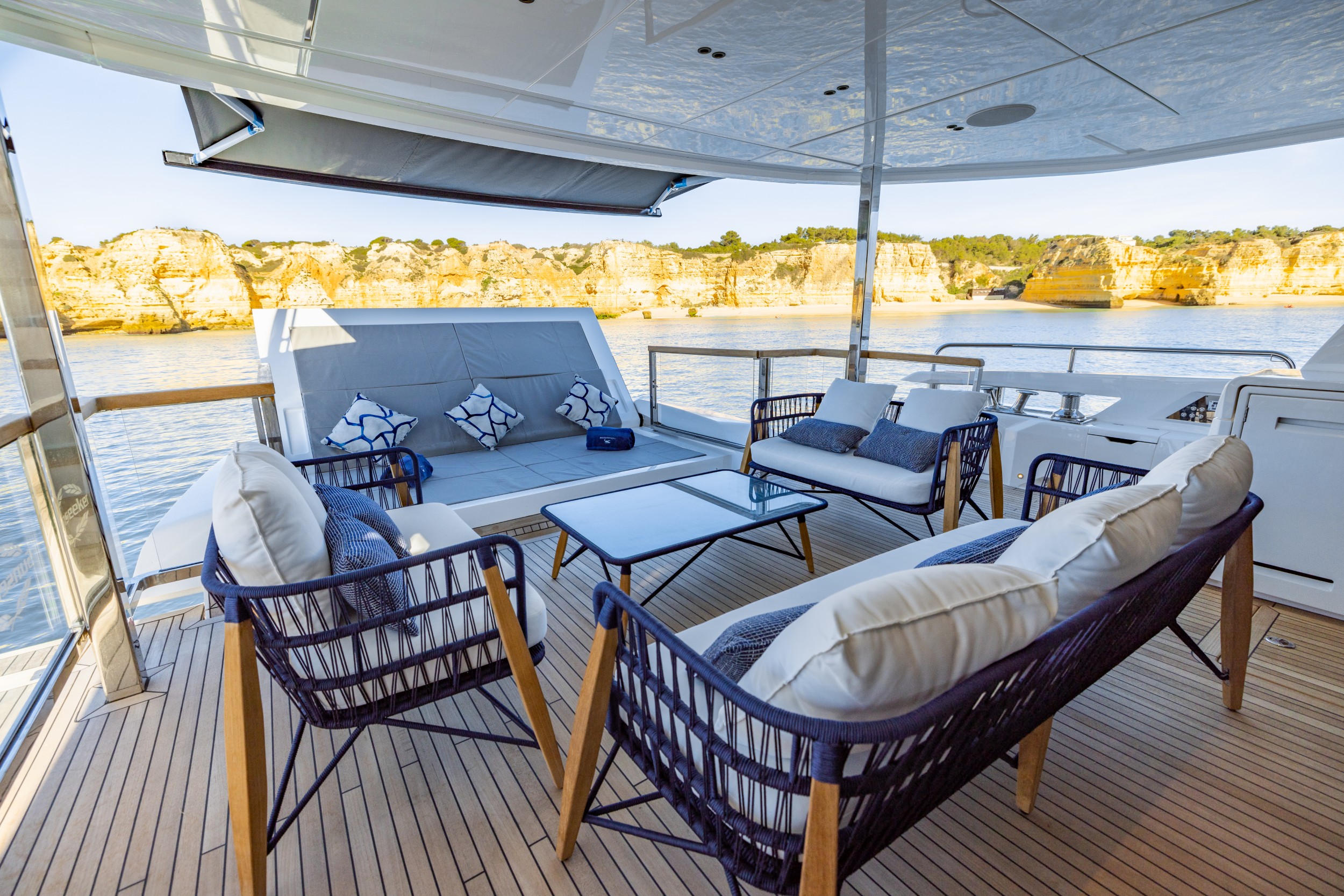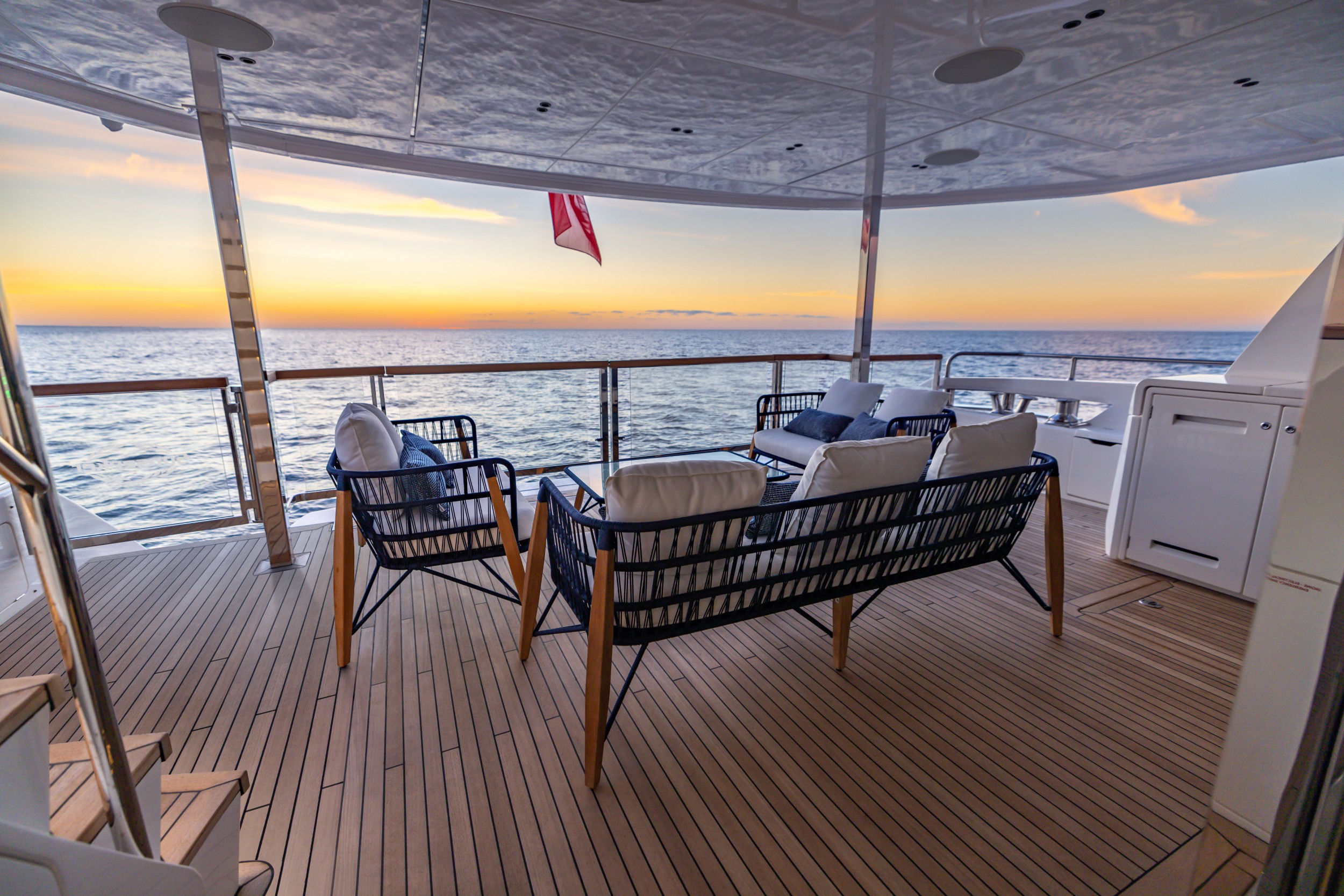 Accessed by dual staircases, the substantial aft cockpit offers an array of free-standing or fixed seating variations to suit owner preference, an integrated wet bar with a fridge, ice maker, stainless steel sink and ample storage lockers.