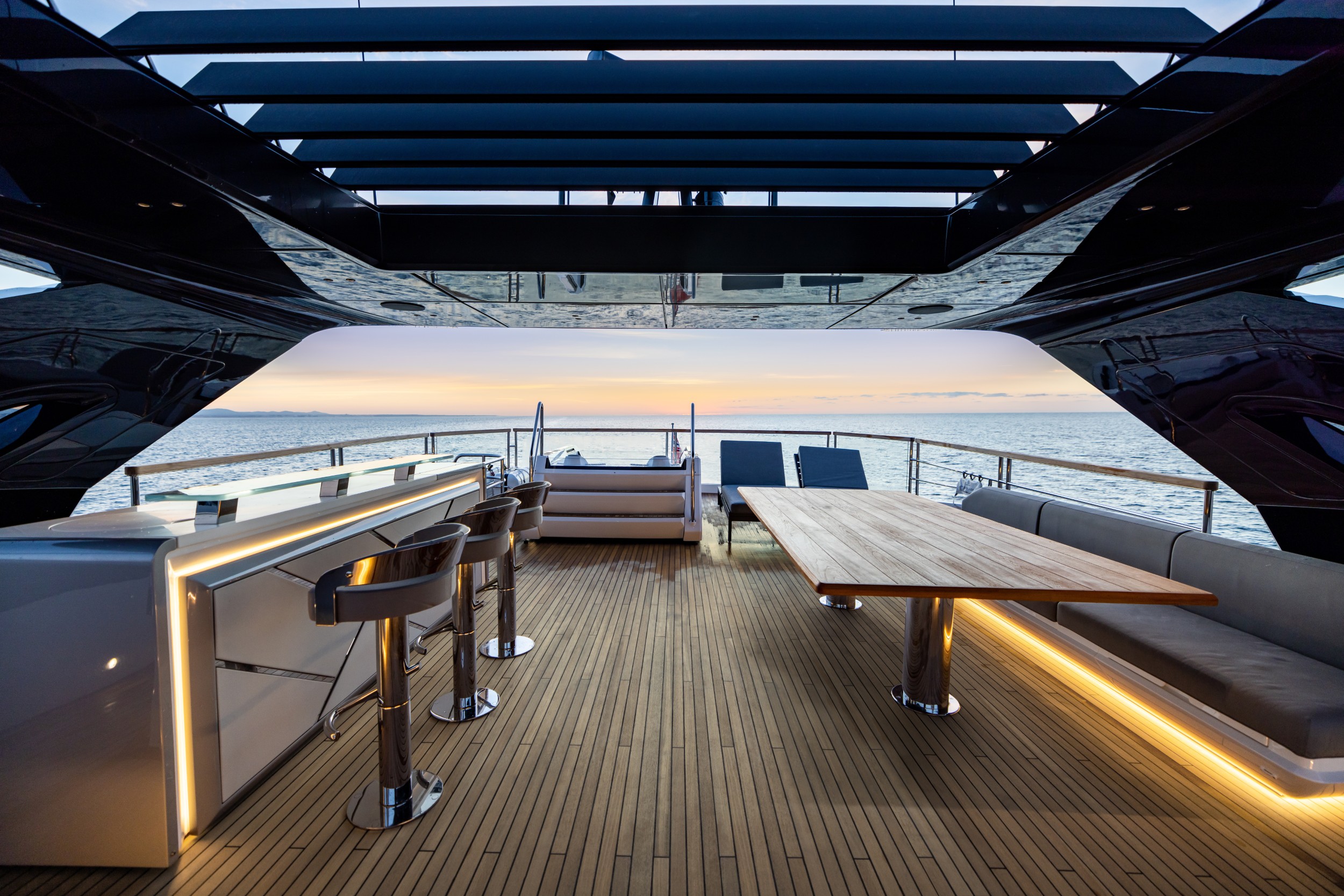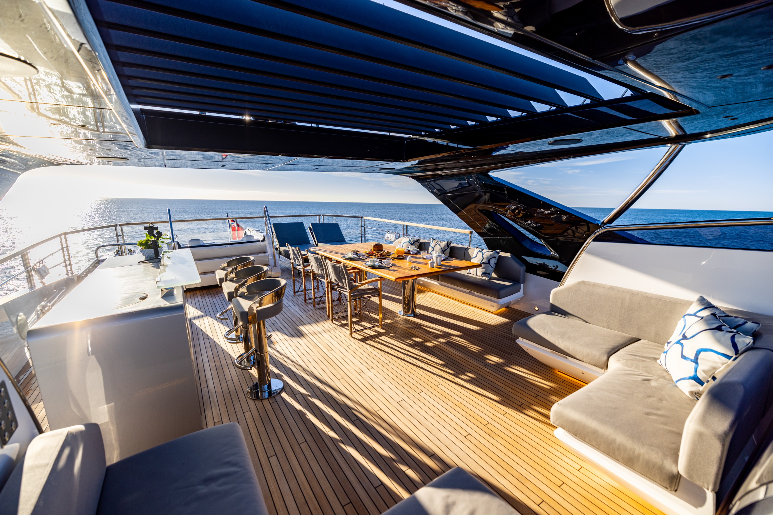 The vast flybridge flows seamlessly into the foredeck with uninterrupted walk-around access on both sides. With generous L-shaped seating, fully-equipped wet bar and space for a spa bath and accompanying sunpads or free-standing loungers, the flybridge is a remarkable space for entertaining. The foredeck provides another social space with two separate seating arrangements plus an oversized sunpad, complete with ample storage and refrigeration options. Later in the day, the foredeck can transform into an open-air cinema with laser projector and 140-inch screen that will no doubt capture the imagination of all guests. A new hardtop design is available with glazing or retractable tilting vains for added shade control.
