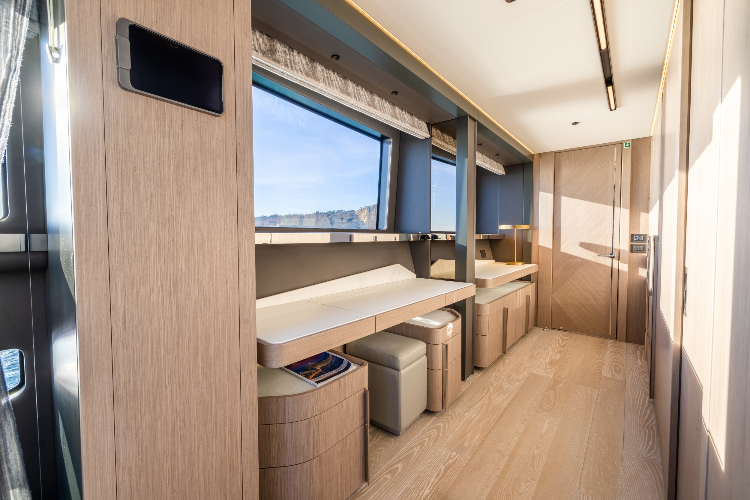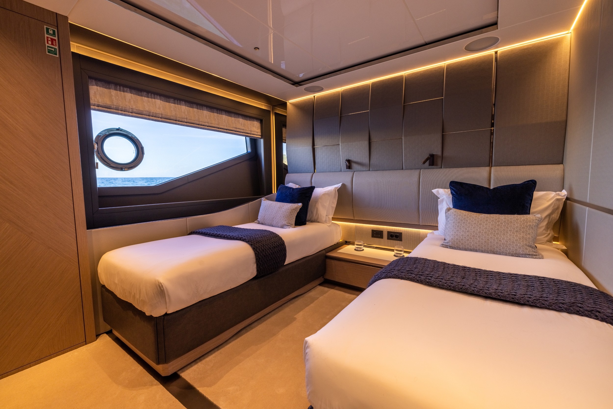Its unique main deck, penthouse-style saloon and luxurious staterooms offer a new-found design direction and material selection providing elegant interiors to enchant any owner. The layering of textural elements and the mix of furnishings and fabrics feels timeless with a modern twist that exudes simplicity and sophistication.