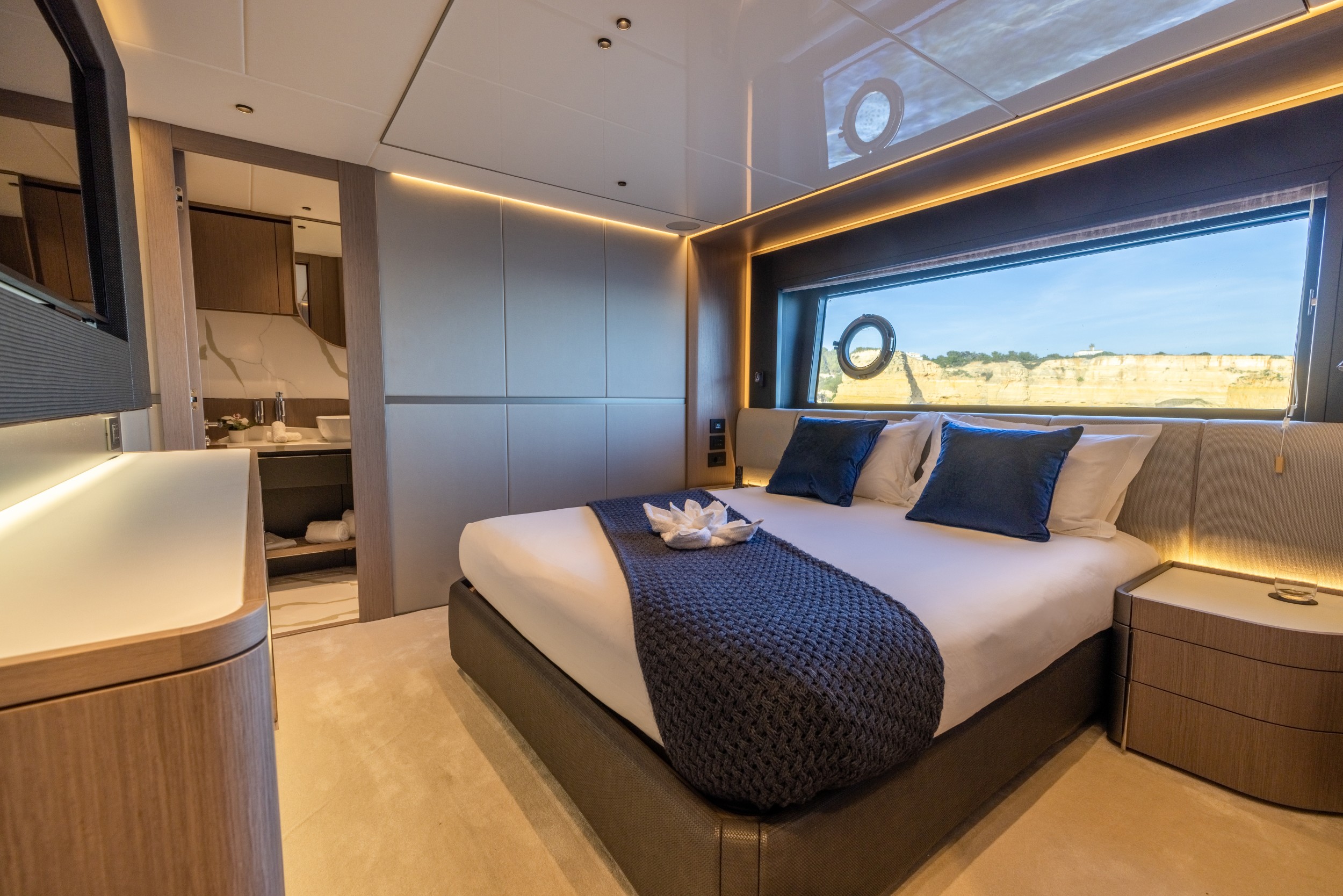 The Sunseeker 100 Yacht elevates luxury with a full-beam owner’s suite positioned on the main deck, complete with direct access to a private foredeck terrace. Floor-to-ceiling glazing floods the space with natural light, creating a true on-the-water penthouse experience with unmatched privacy and panoramic views.