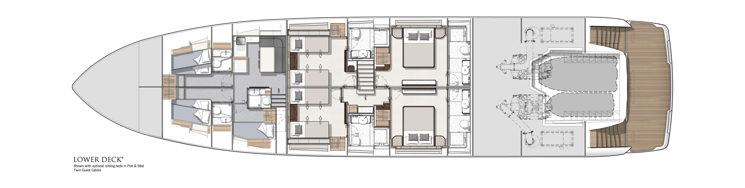 The yacht can be specified as a four or five cabin boat, ideal for the charter market. In either case, the twin amidship cabins can be fitted with Pullman berths for added flexibility. The crew cabin is also worthy of mention, featuring a Captain’s cabin with en suite, two twins each with en suite, a highly specified crew mess and laundry appliances.