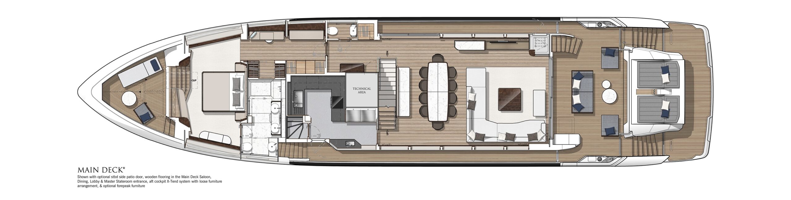 The unique main deck layout includes a luxurious Master Stateroom forward for even greater flexibility and freedom on board. This full-beam stateroom is simply spectacular, offering a large lobby entrance, walk-in wardrobe with feature shelving, an office and a generous en suite with twin washbasins and rain shower. Bathed in natural light courtesy of expansive panoramic glazing, owners can also access a first-in-class bow terrace for ultimate privacy through a cleverly sculptured, fully-glazed sliding door forward.