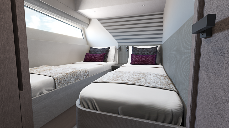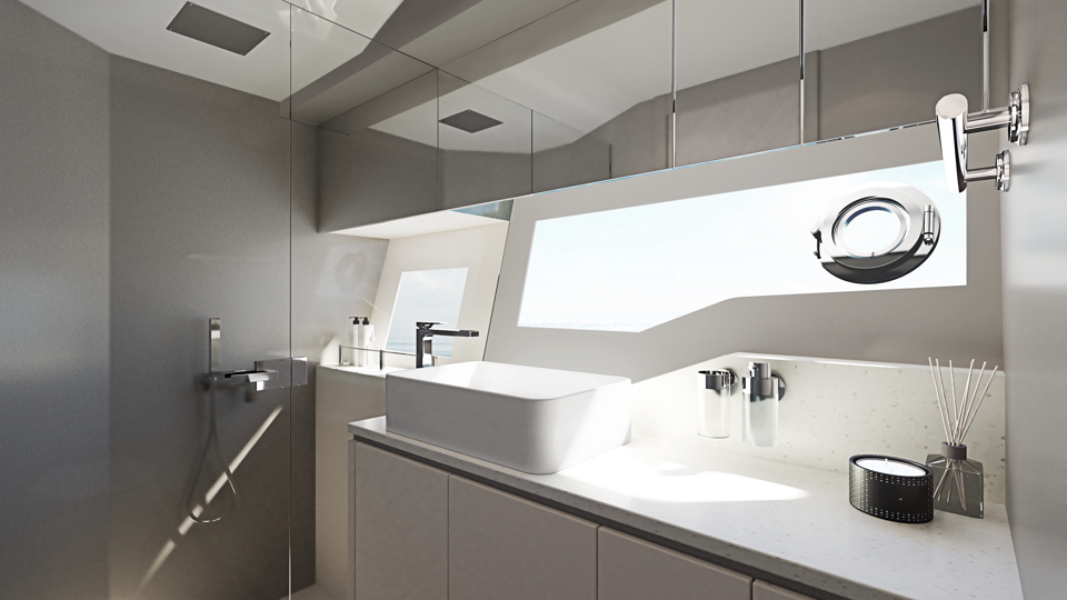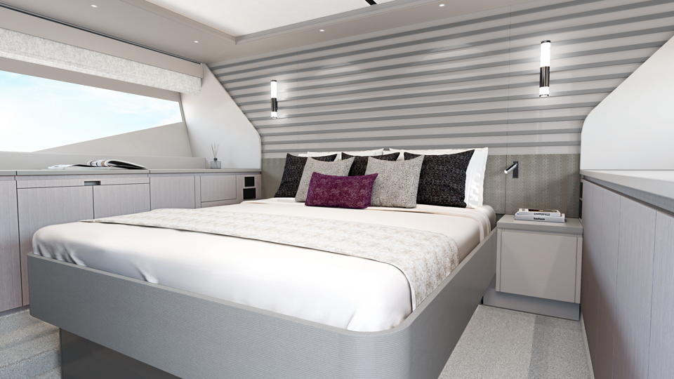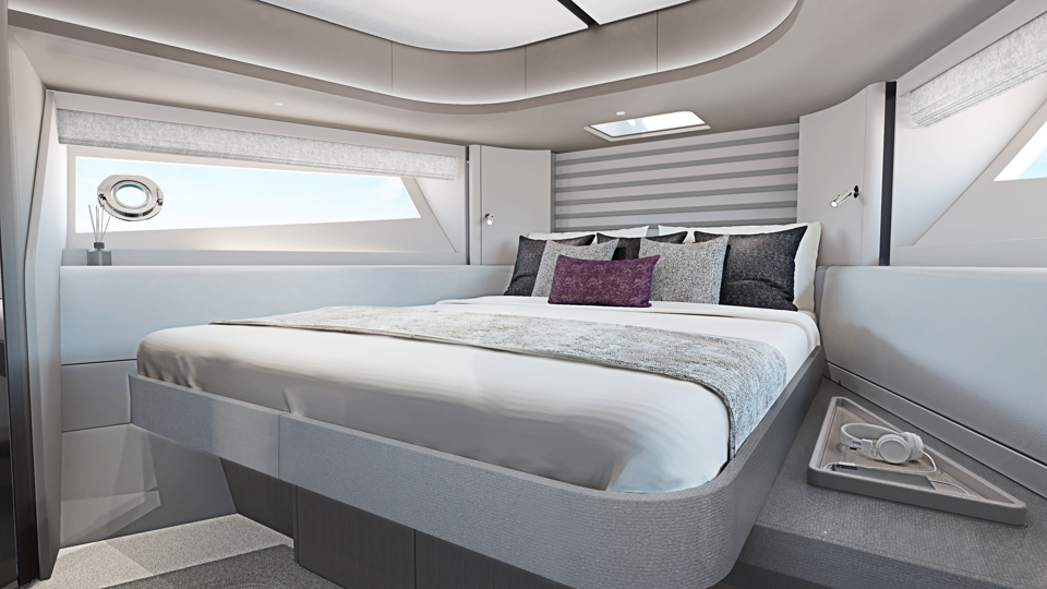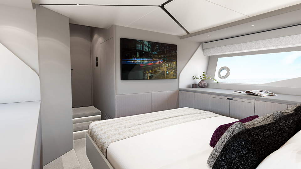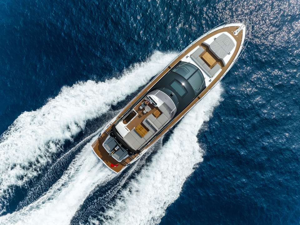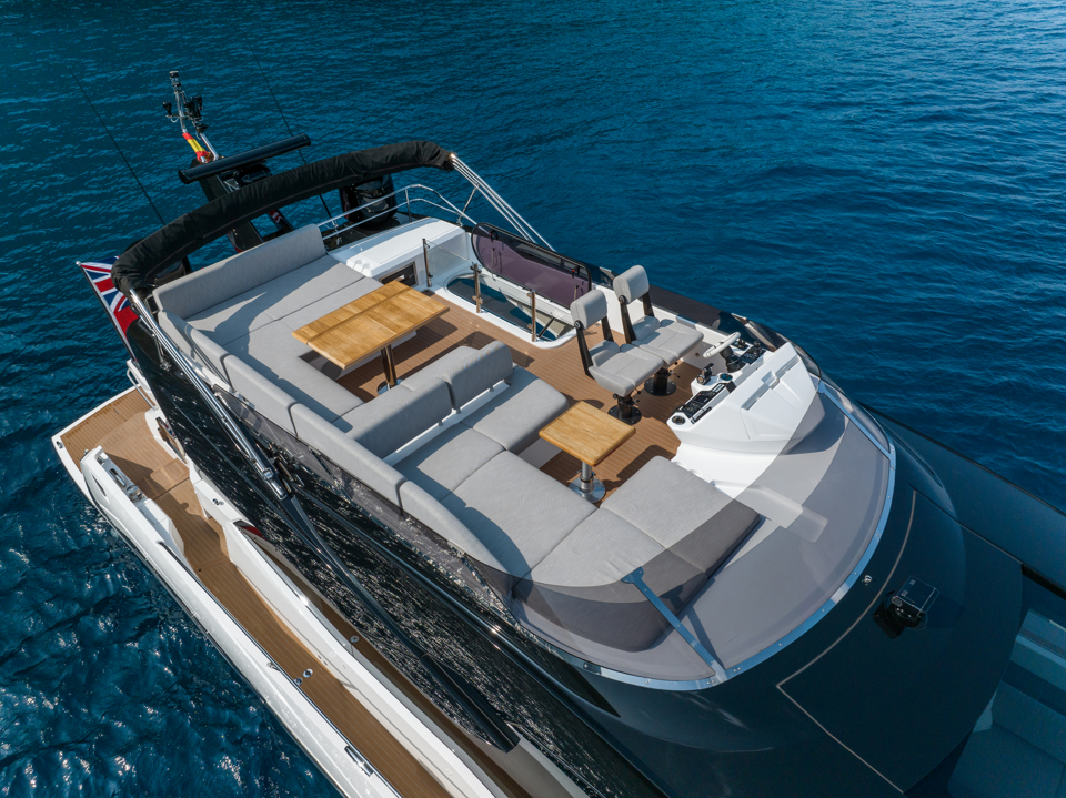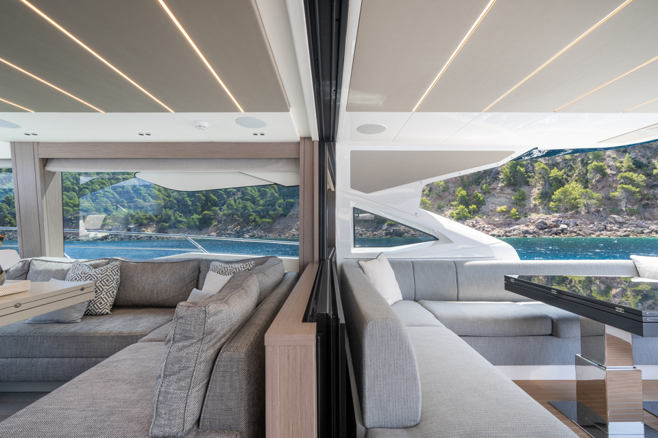 Aesthetic styling is prevalent in every detail. The yacht profile turns heads with stainless steel air intake cowlings and exterior handrails, contributing to the high-quality finish. There is an enhanced material selection, with new exterior upholstery and moulding options. Adventurous buyers will be captivated by a choice of four new grey hull colours. Overall, the exterior is aggressive and imposing, with a new, angular hull and superstructure glazing design.
