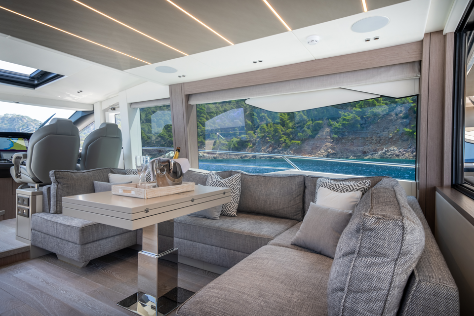The design extends throughout the interior. Exquisite woods, contrasting fabrics and rich lacquers, paired with indirect and dimmable lighting, create a sophisticated and striking ambience. Bold features include carbon fibre trims, sharp accent designs, reflective surfaces and stainless-steel cabinet detailing. A double-piece windscreen improves visibility and invites light into the main deck. The interior space is customisable from the material selection to the configuration. The main deck seating centres around a fold-out table on the starboard side and a large television unit on the port side in a standard arrangement, all flooded by natural light thanks to the full height glazing. The comprehensively equipped helm station is forward of the U-shaped sofa, maintaining a typical Sunseeker layout.