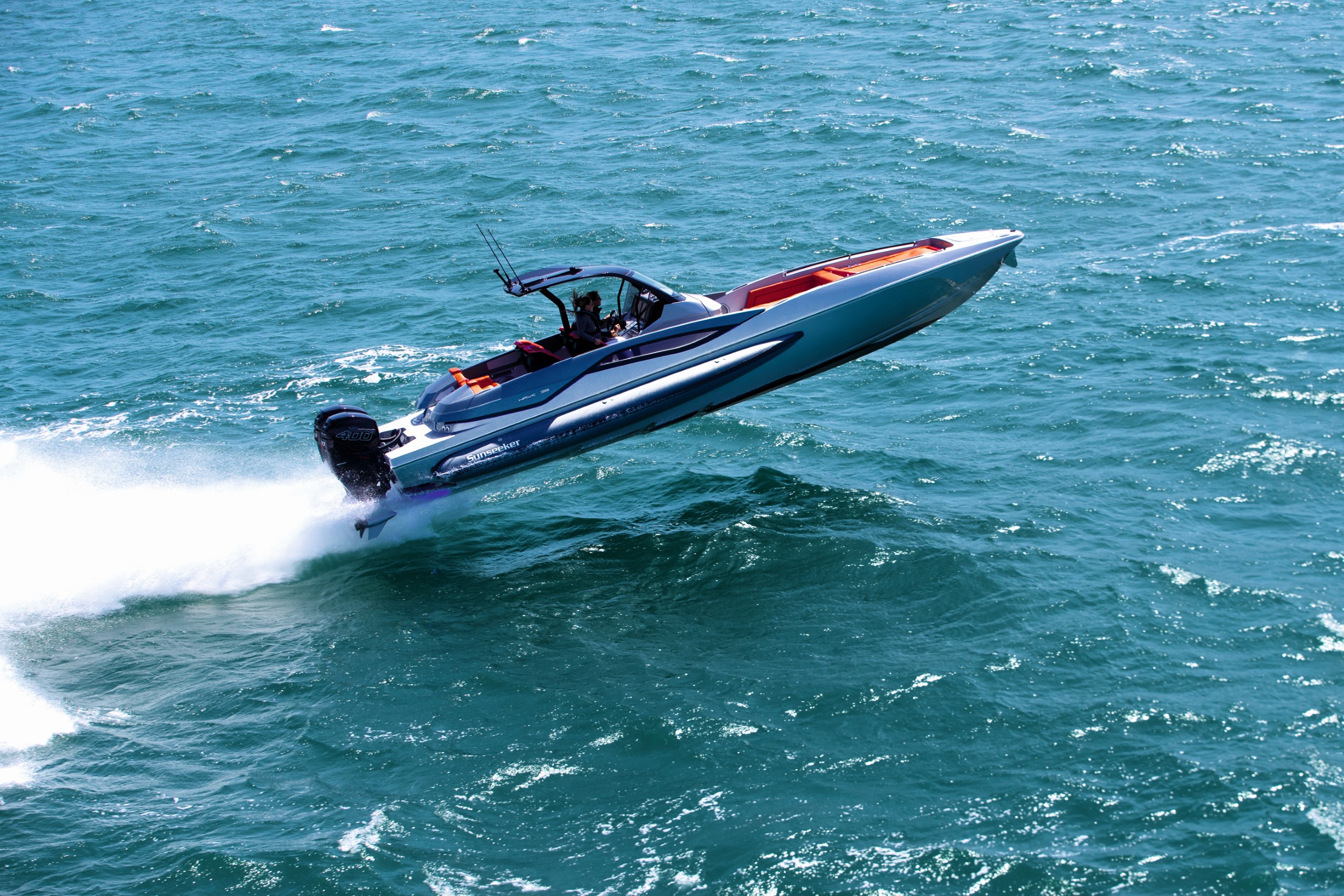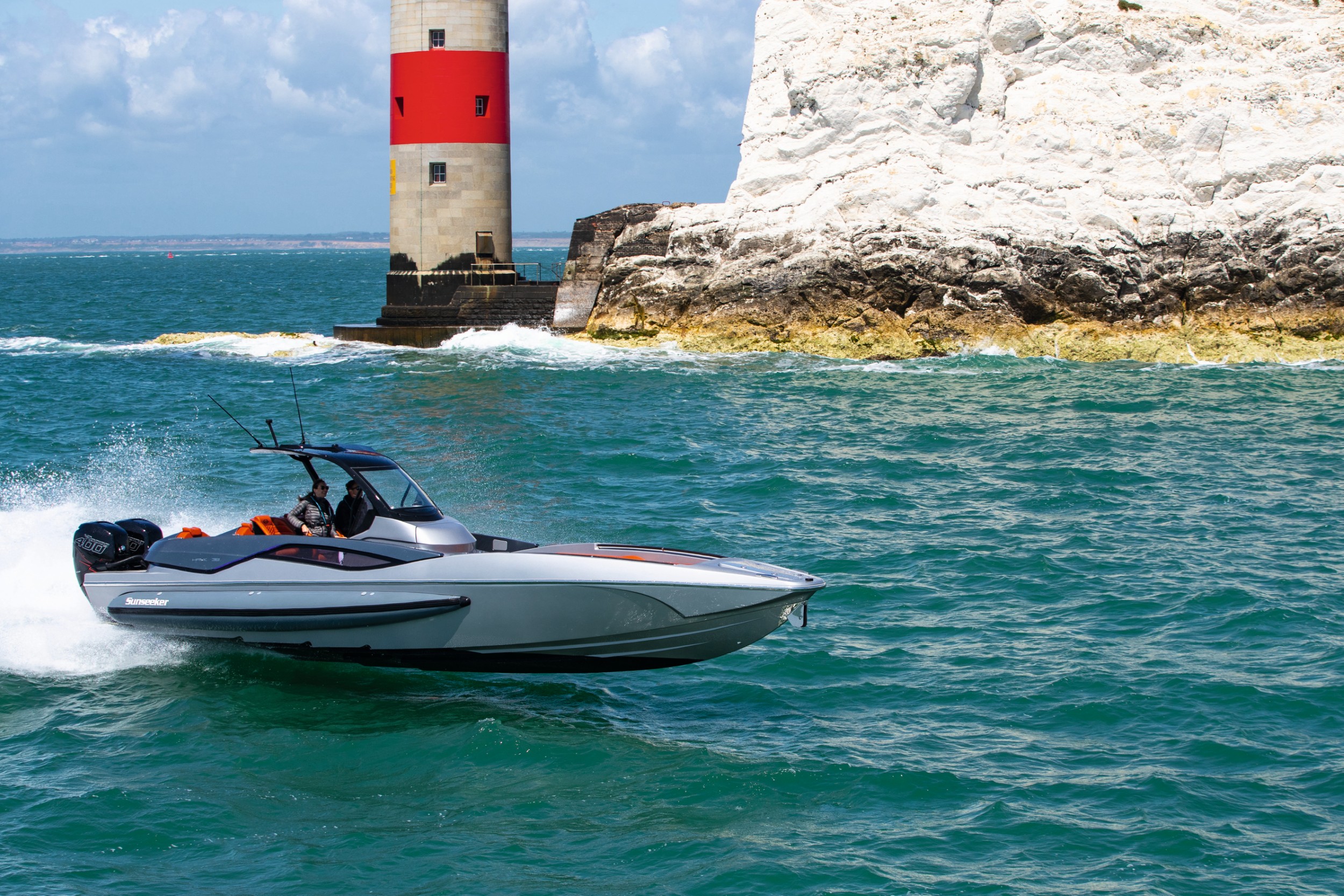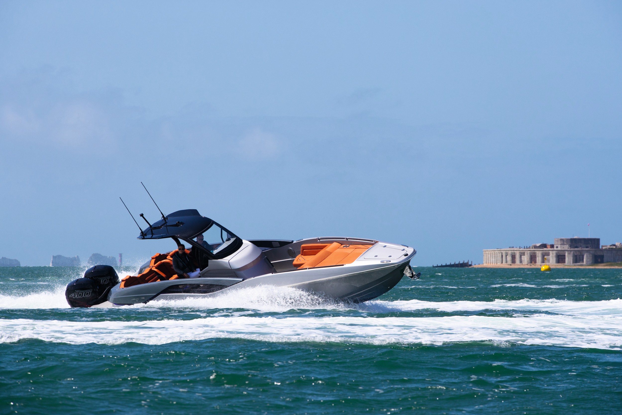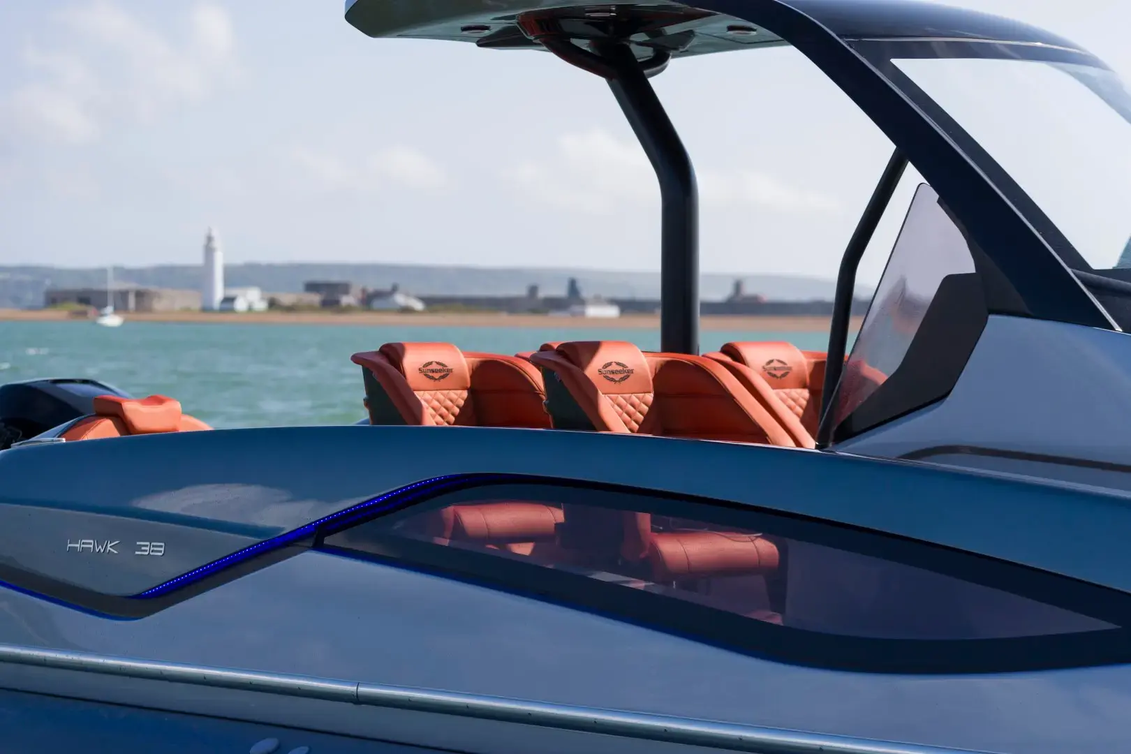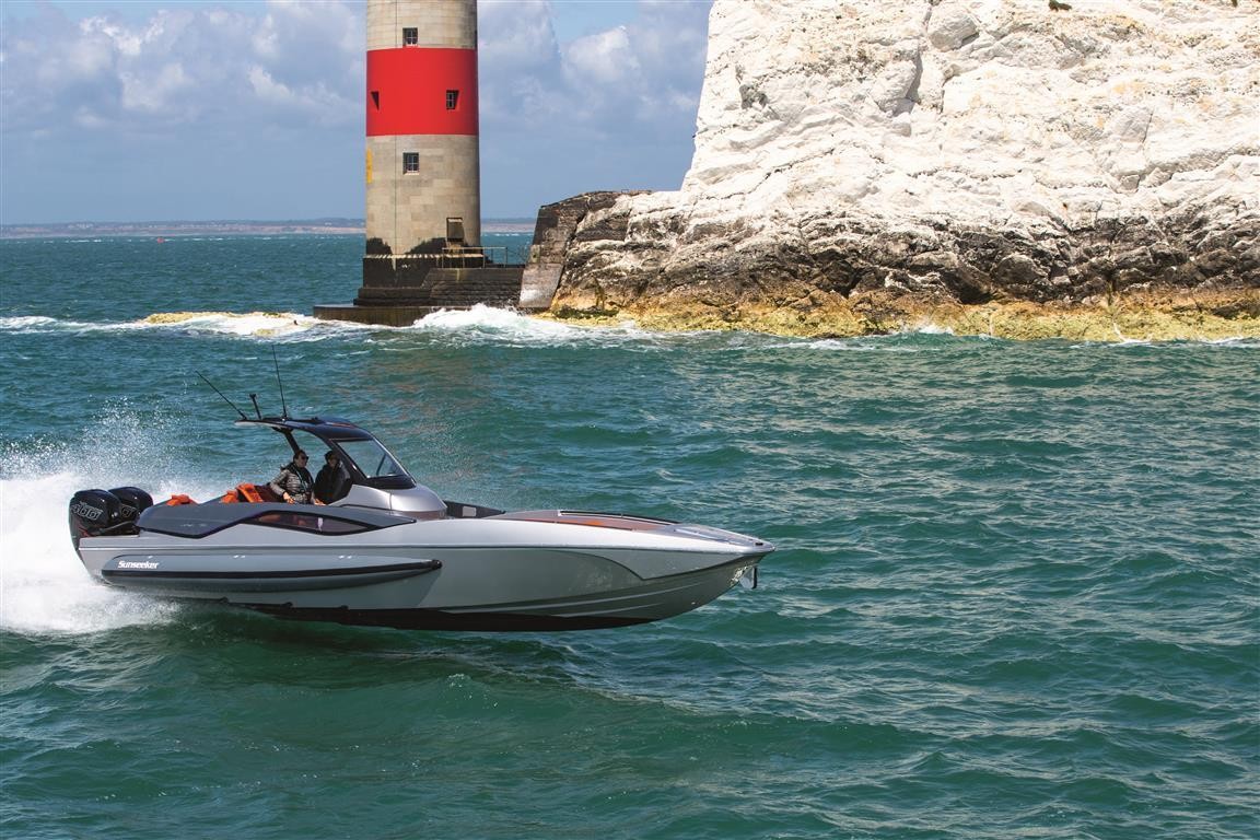 Drawing on the Sunseeker racing heritage, the new high-performance Sunseeker Hawk 38 will be capable of up to 62 knots with standard twin Mercury 400R outboards and Mercury Racing Digital Zero Effort throttles.