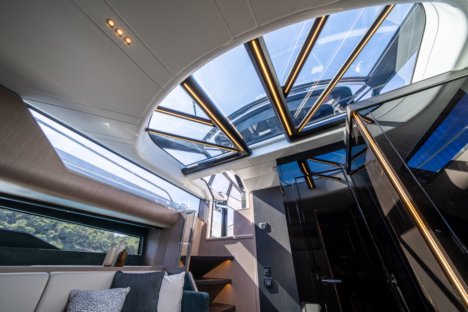 Steps lead down to a highly luxurious open plan lobby and galley area sat beneath LED lighting. Further recessed lighting, curved wood and lacquer finishes all contribute to the premium feel that truly delights those who step on board. The light floods through from the expansive screen above and electrically operated blinds allow intimacy and shade when needed. Forward is a VIP cabin with en-suite, upholstered side units and a wardrobe unit to port. There is a large bed and the interior comes with different styling palettes throughout to give a customised and personal feel to every owner. Aft is the Master cabin with sliding berths to generate either a double or two singles and generous en suite. Black lacquer panels frame this main cabin creating an ambiance that is pure indulgence.