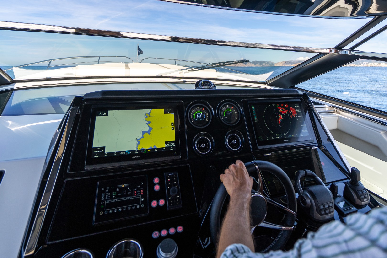 Powered by twin Volvo Penta IPS 950 engines, the Superhawk 55 delivers speeds approaching 40 knots with exceptional agility and handling. Its advanced hull design paired with joystick-controlled IPS technology provides a smooth, confident ride whether carving tight turns offshore or cruising comfortably at speed.